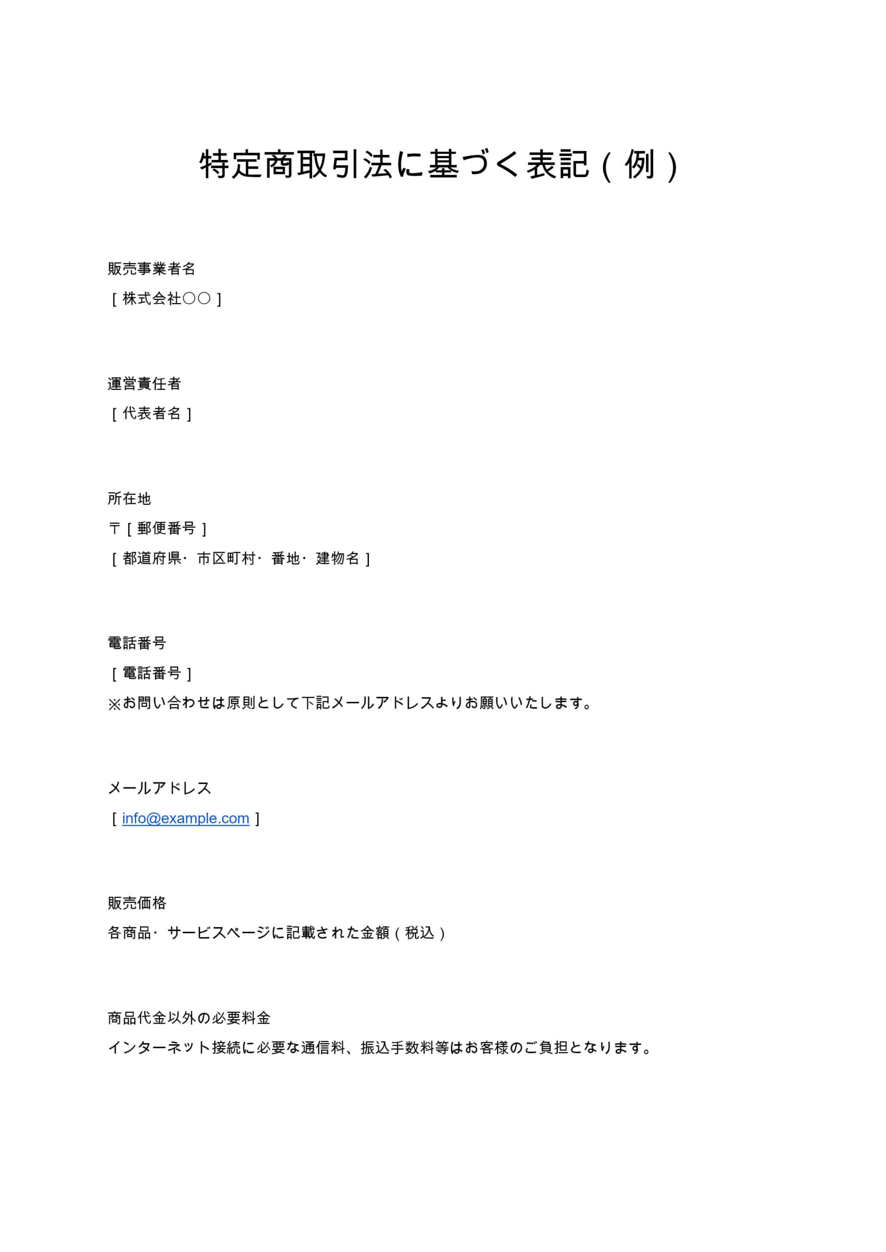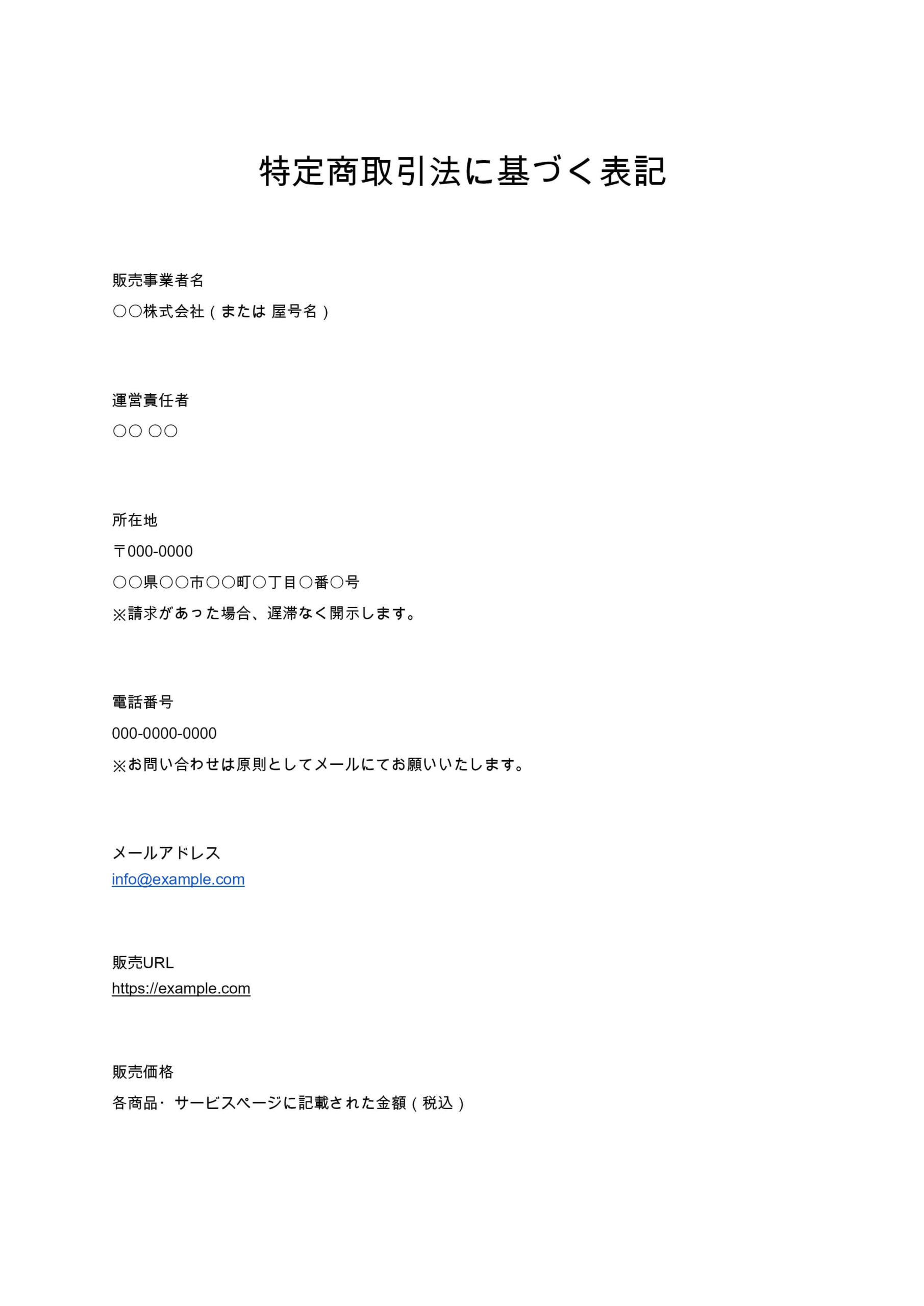 特定商取引法に基づく表記は、ECサイトやオンラインサービスを運営する事業者に義務付けられている法定表示です。本ひな形は、販売事業者情報、支払条件、返品規定などを網羅し、Webサイトにそのまま掲載できる...