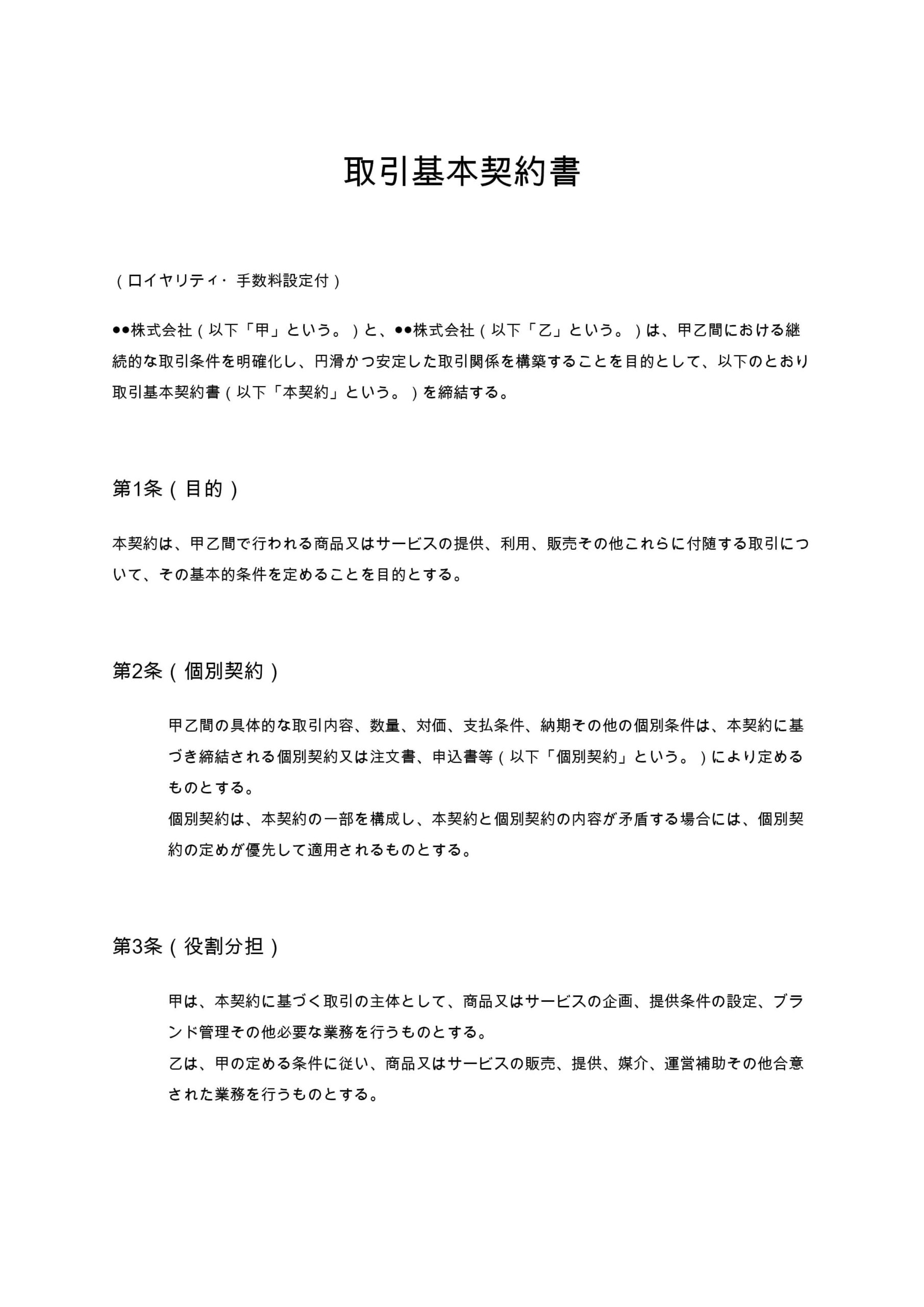 取引基本契約書(ロイヤリティ・手数料設定付)は、継続的な取引関係において、ロイヤリティや各種手数料の算定方法・支払条件をあらかじめ明確化するための契約書です。フランチャイズ、業務提携、代理販売など、定...