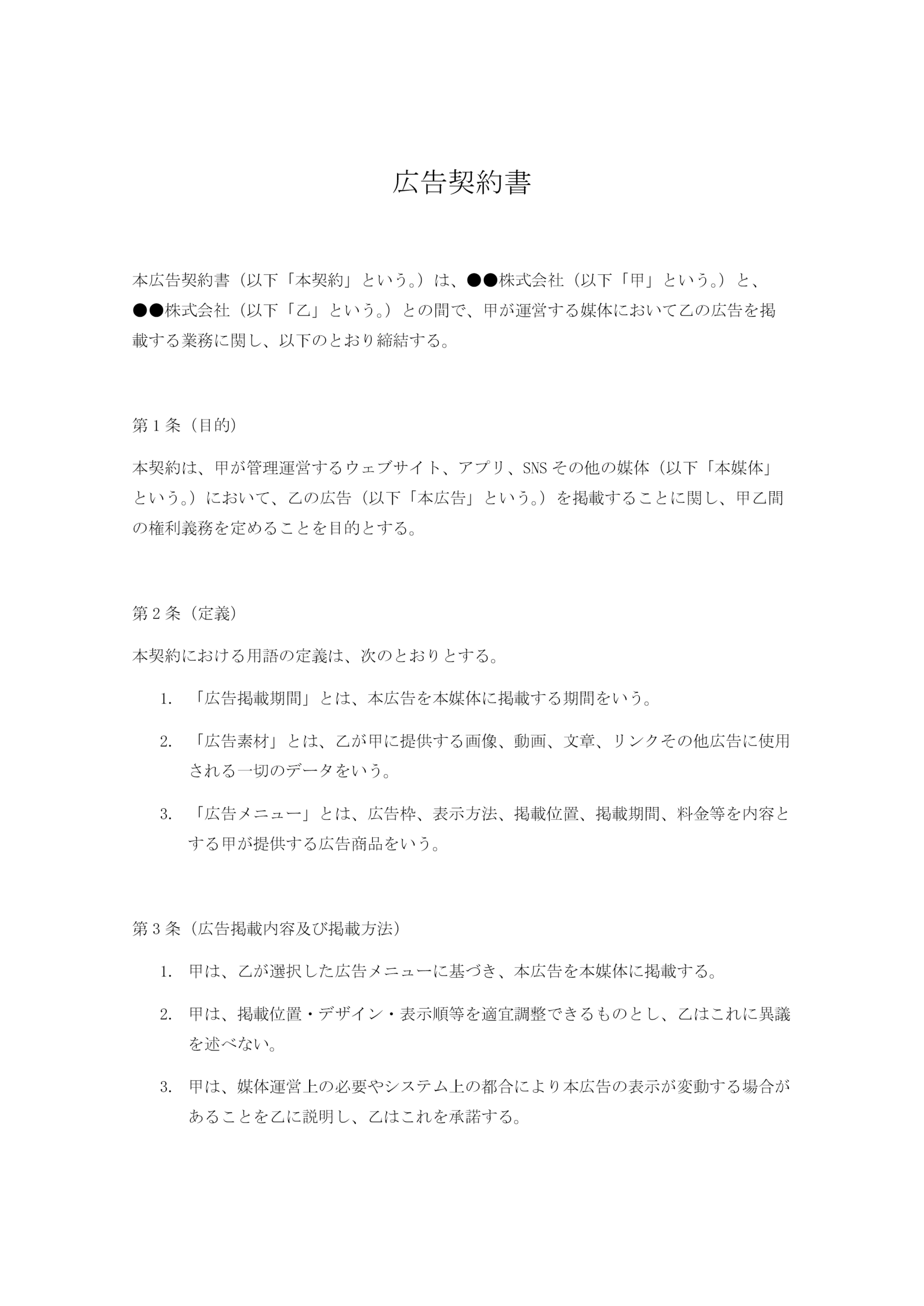広告契約書は、広告主と媒体運営者の間で、広告の掲載内容・期間・料金・掲載方法などを取り決める文書です。広告の表示トラブルや成果認識の相違を防ぎ、双方の責任範囲を明確にするために必要となります。...
