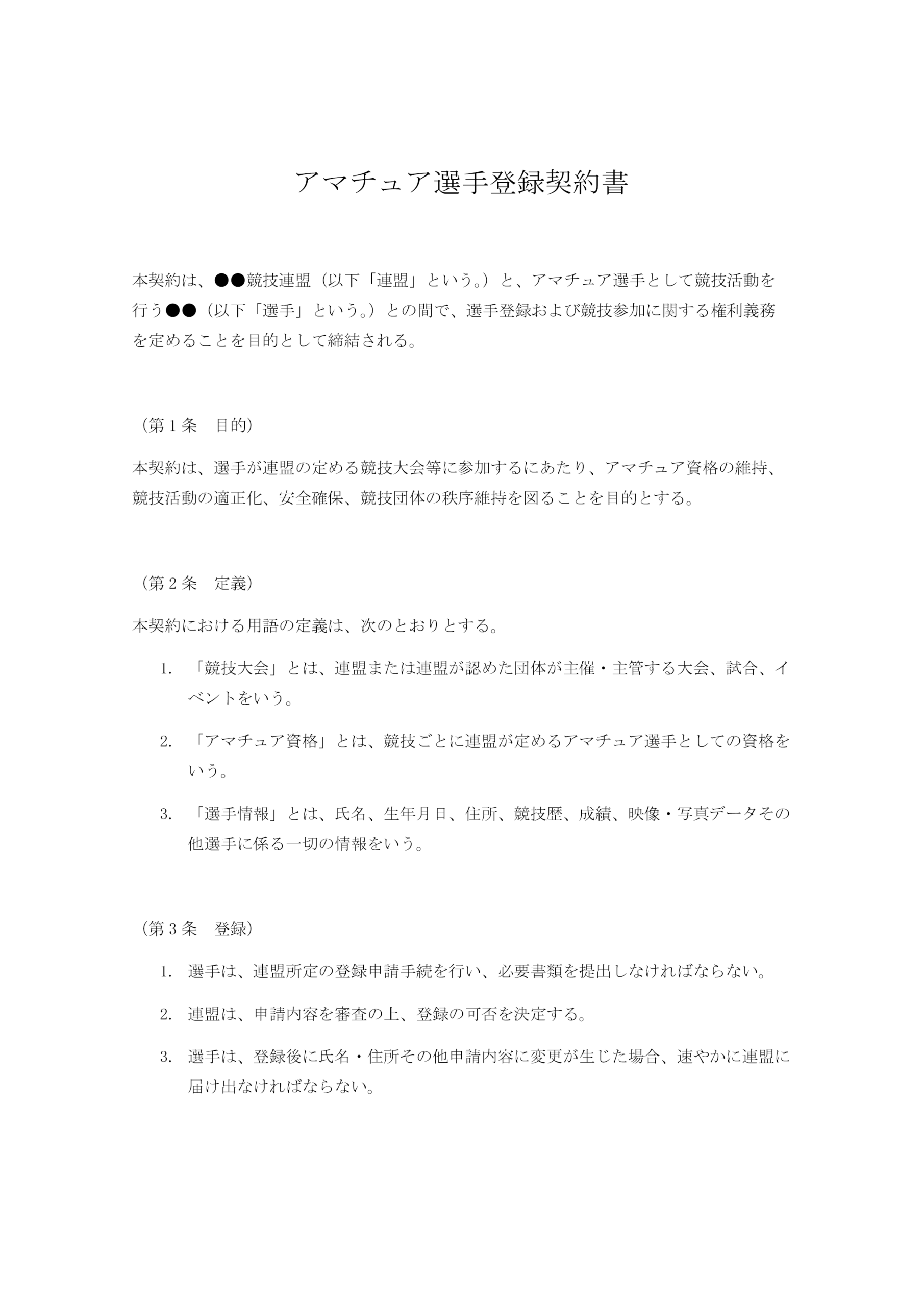 アマチュア選手登録契約書は、選手が連盟主催の大会へ参加するための登録条件、アマチュア資格の維持義務、安全管理、禁止事項、個人情報の取り扱いなど、競技活動に必要な基本ルールを定める契約書です。...