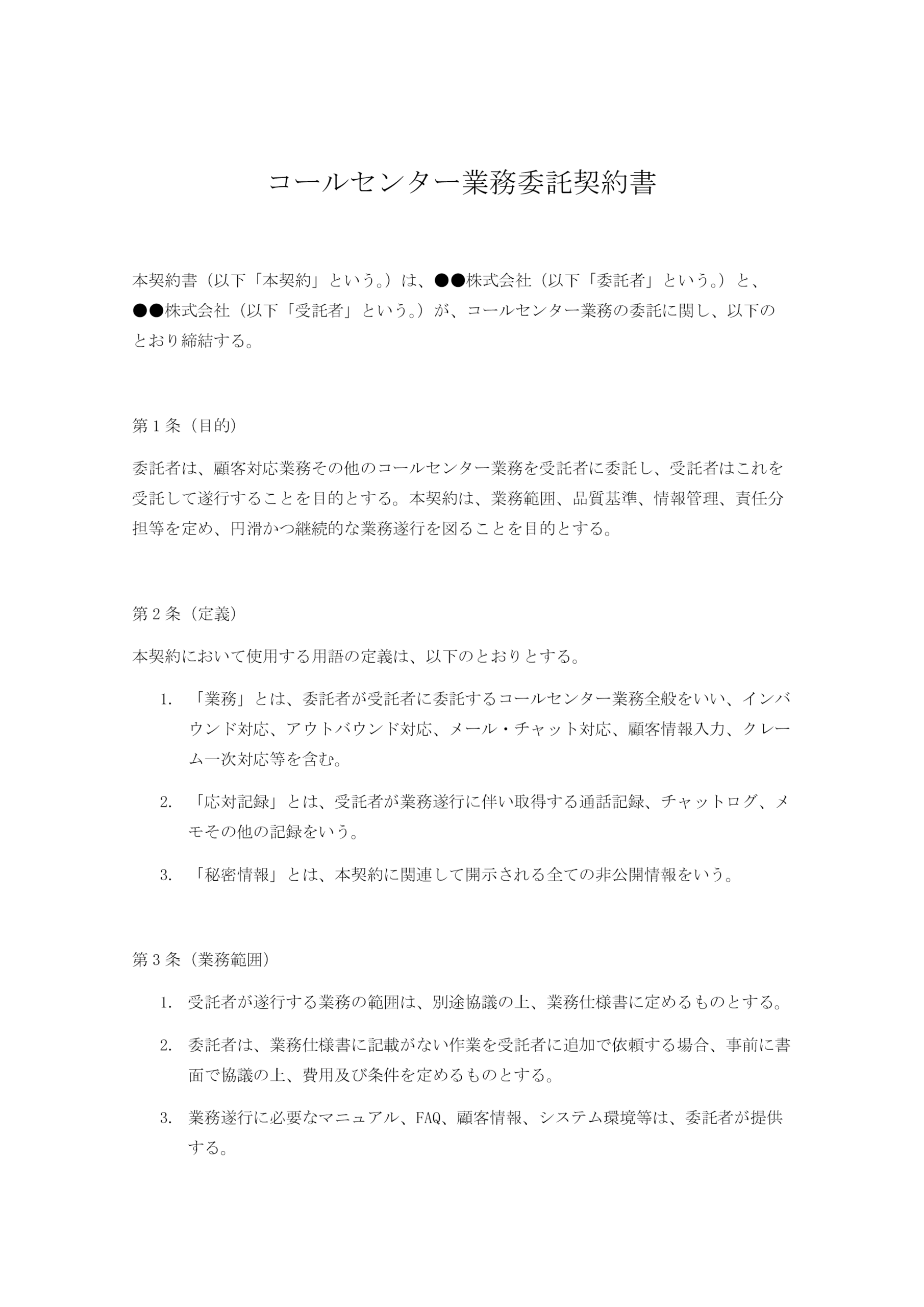 コールセンター業務委託契約書は、インバウンド・アウトバウンド対応、顧客情報管理、応対品質基準、個人情報保護、秘密保持など、受託者に委託するコールセンター業務の範囲や責任を明確に定めるための契約書です。...