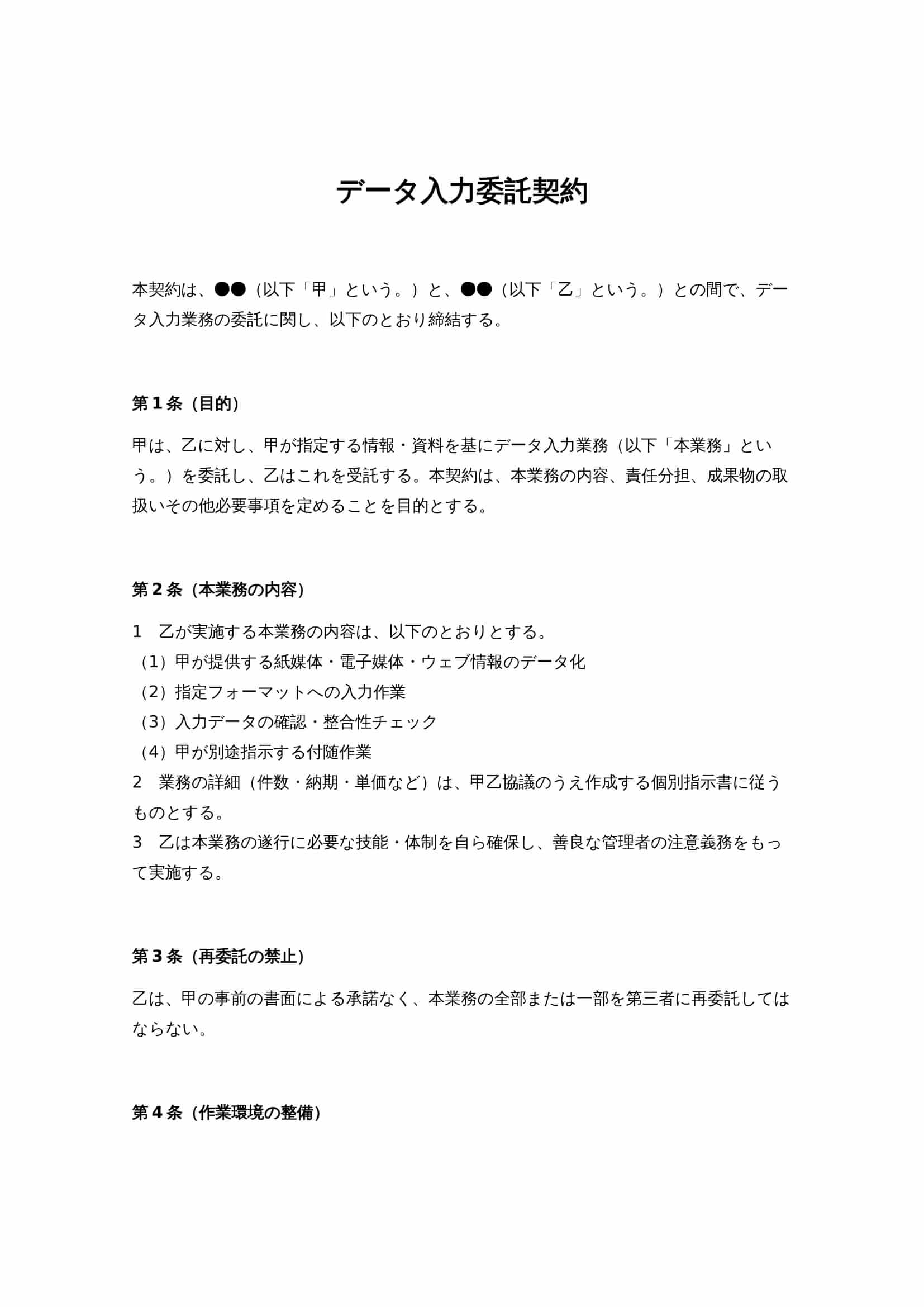 データ入力委託契約書は、企業が外部事業者へデータ入力業務を依頼する際の業務範囲・納期・秘密保持・成果物の権利関係を明確化するための契約書です。情報漏えいや誤入力リスクを防ぎ、適正な業務品質を確保するた...