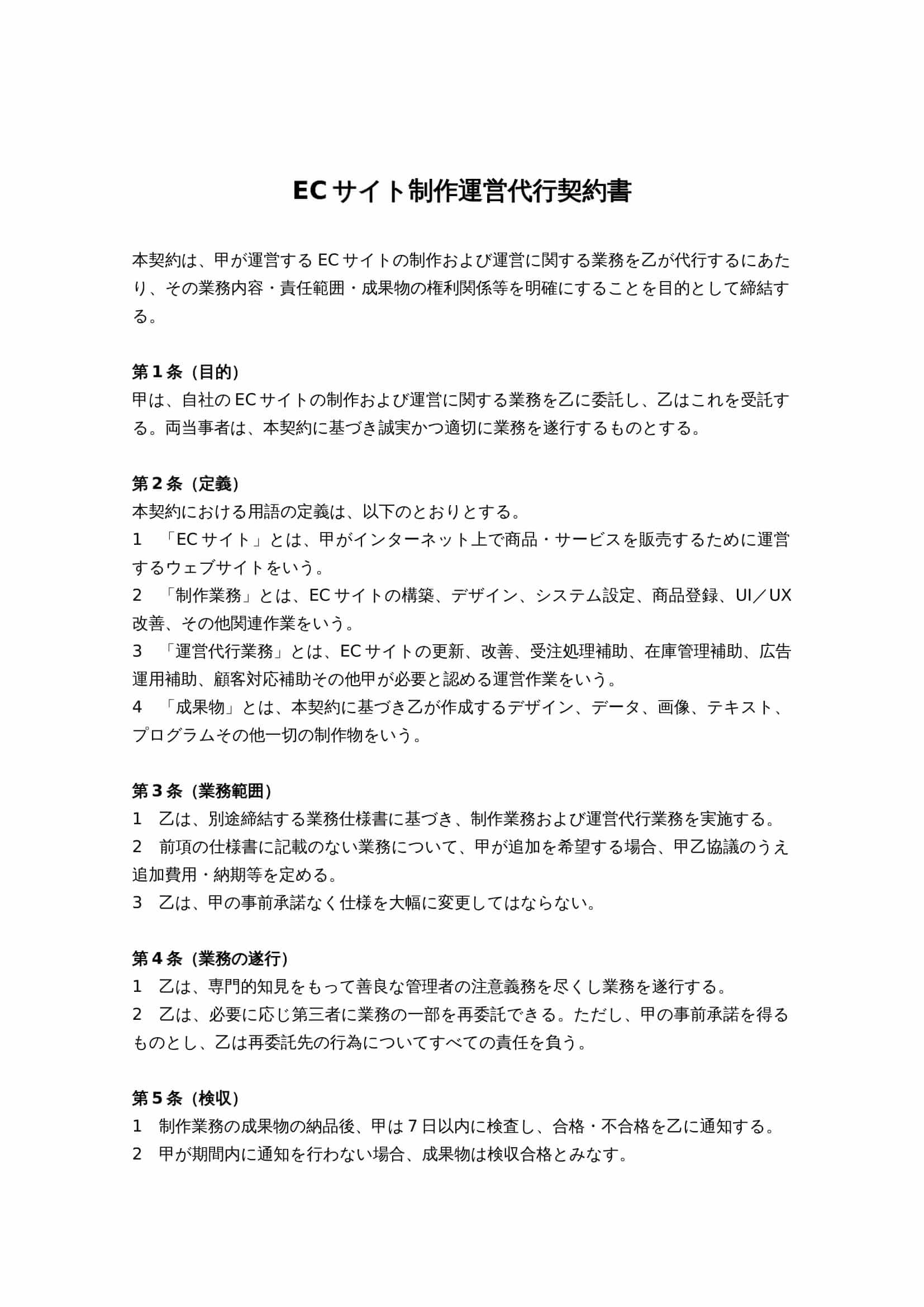 ECサイト制作運営代行契約書は、ECサイトの構築から更新・受注処理補助・改善提案まで、運営を外部委託する際の業務範囲や責任、権利関係を明確化するための契約書です。制作物の著作権やデータ管理、秘密保持な...