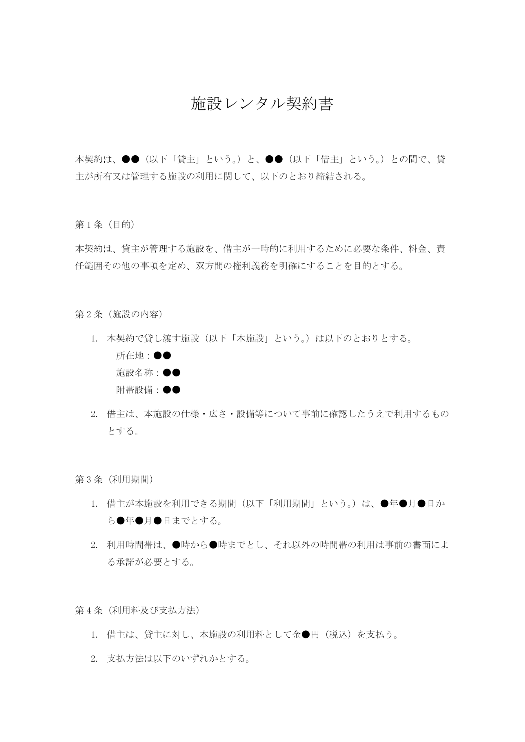 施設レンタル契約書は、会議室・スタジオ・イベントホールなどの施設を一時的に利用する際の条件や料金、禁止事項、損害賠償範囲を定める文書です。利用者と施設管理者のトラブル防止を目的とし、設備破損やキャンセ...