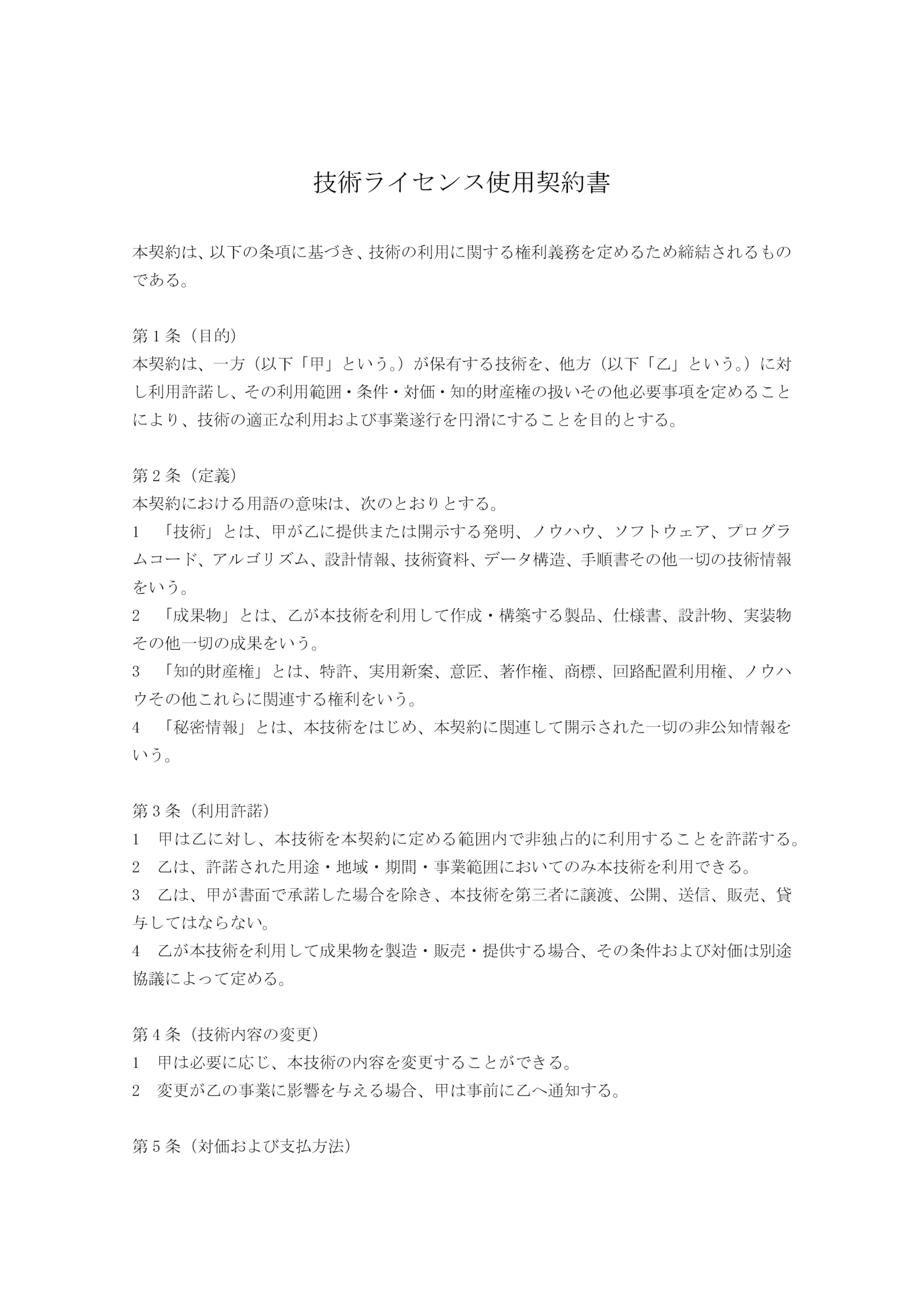 技術ライセンス使用契約書は、企業が保有する技術を他者へ利用許諾する際に、その範囲・条件・権利帰属・秘密保持などを定める契約書です。技術提供型の協業、製品開発、OEM・共同研究など幅広い場面で活用されま...