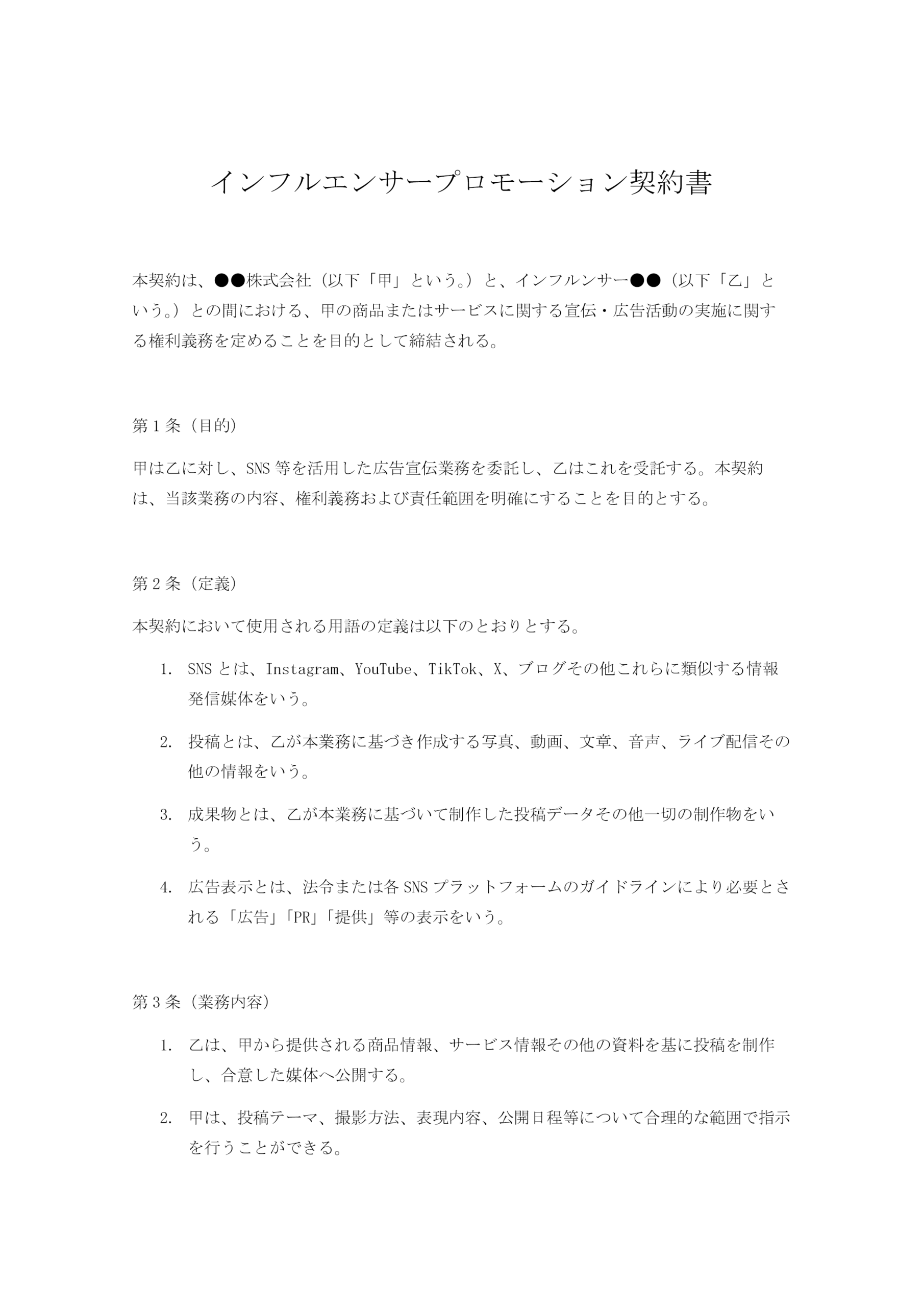 インフルエンサープロモーション契約書は、企業がインフルエンサーに商品・サービスの宣伝を委託する際の業務内容、広告表示、著作権、報酬、秘密保持などの権利義務を明確にする契約書です。SNSを活用したプロモ...