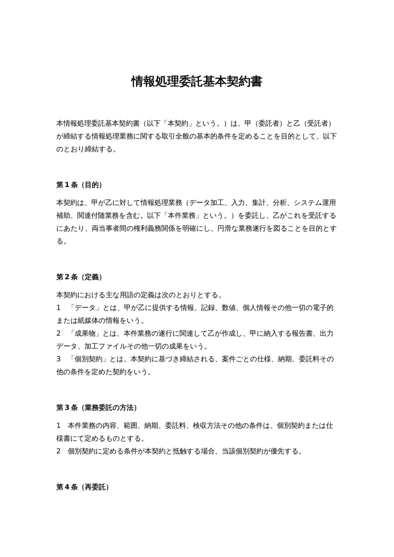 情報処理委託基本契約書は、データ入力・加工・集計・分析などの情報処理業務を外部に委託する際に、取引全体の共通ルールを定める契約書です。業務範囲、秘密保持、データの安全管理、委託料、知的財産権などを体系...