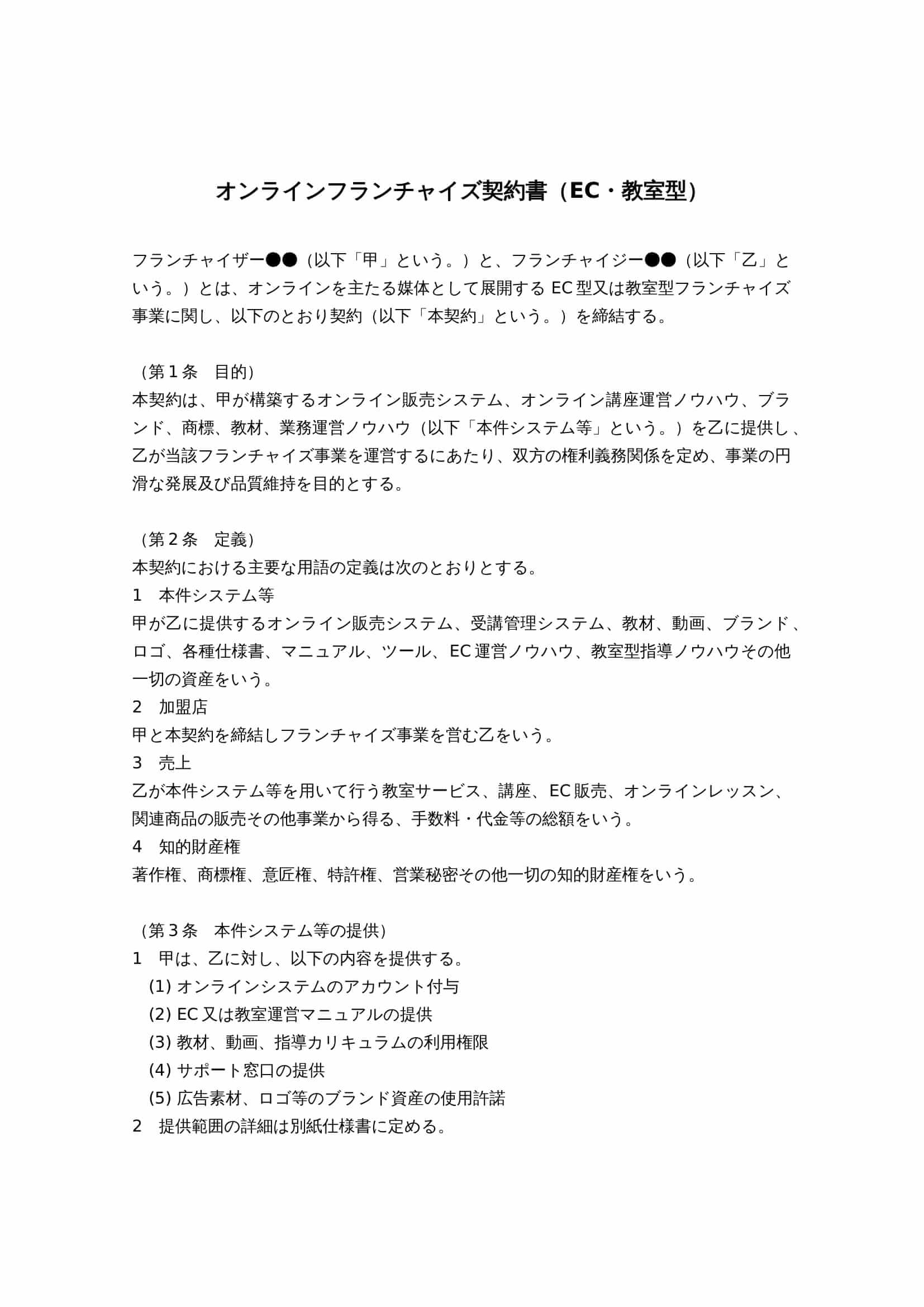 オンラインフランチャイズ契約書(EC・教室型)は、オンライン販売システムや教室運営ノウハウ、ブランド資産の利用を加盟店に許諾し、ロイヤリティや営業条件、知的財産権、秘密保持などを包括的に定める契約書で...