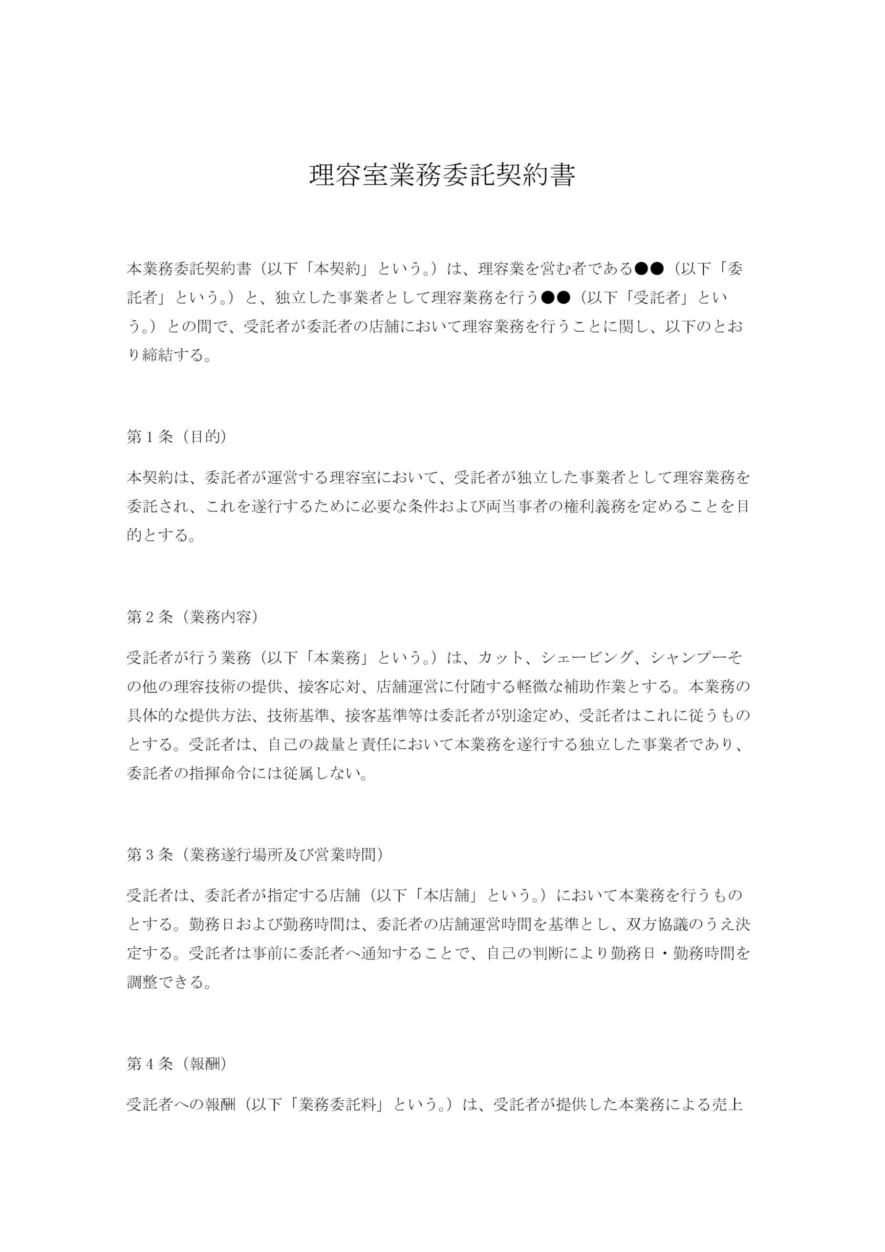 理容室業務委託契約書は、理容師が独立した事業者として店舗で理容サービスを提供する際の業務範囲、報酬、独立性、衛生管理、秘密保持などを明確にする契約書です。雇用契約との違いを整理し、トラブル防止のための...