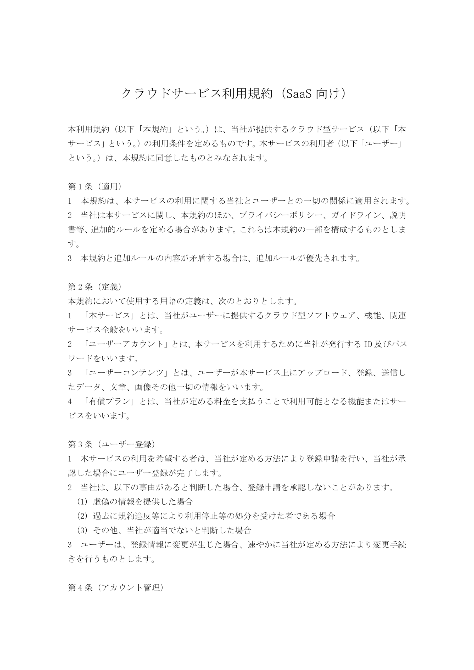 クラウドサービス利用規約(SaaS向け)は、クラウド型ソフトウェアを提供する事業者が、ユーザーとの利用条件・責任範囲・禁止事項・データ扱いなどを包括的に定めるための規約です。Webサイト掲載のみで効力...