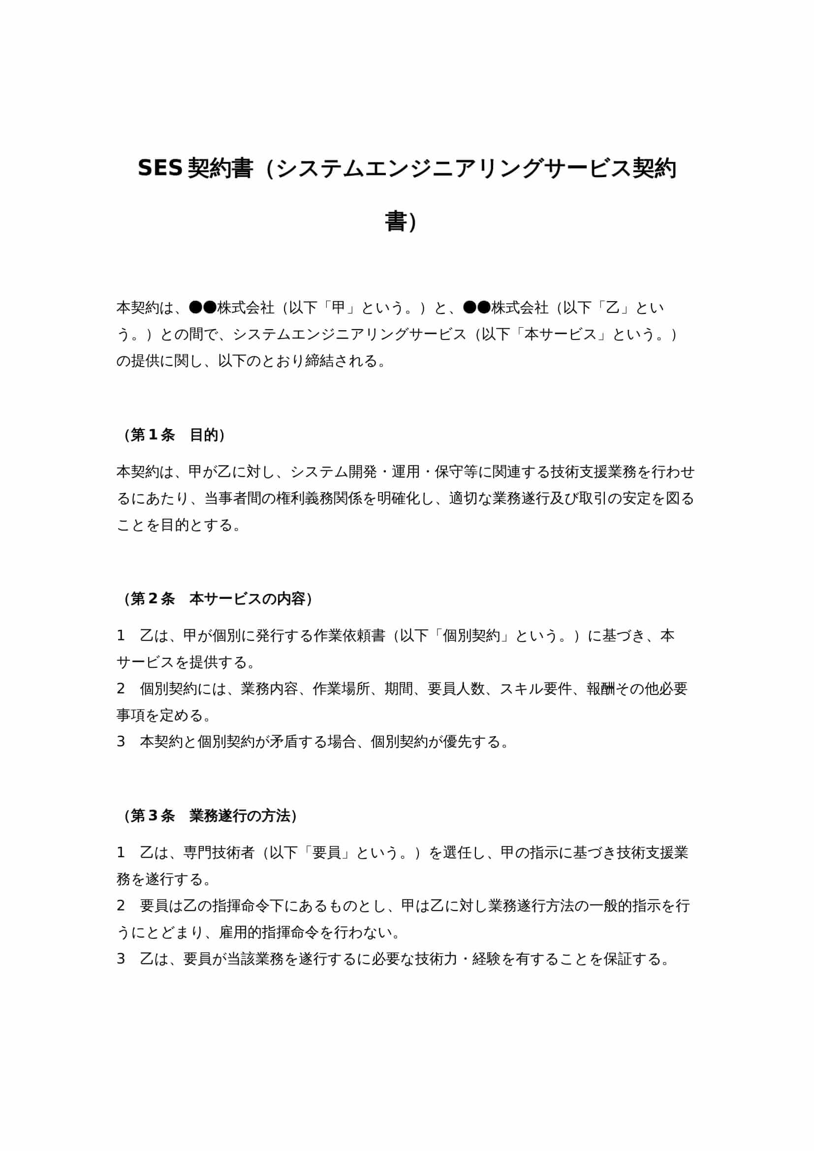 SES契約書(システムエンジニアリングサービス契約書)は、エンジニア常駐による技術支援業務を企業間で安全に行うための基本契約です。要員の管理方法、成果物の扱い、秘密保持、精算ルールなどを明確化し、トラ...