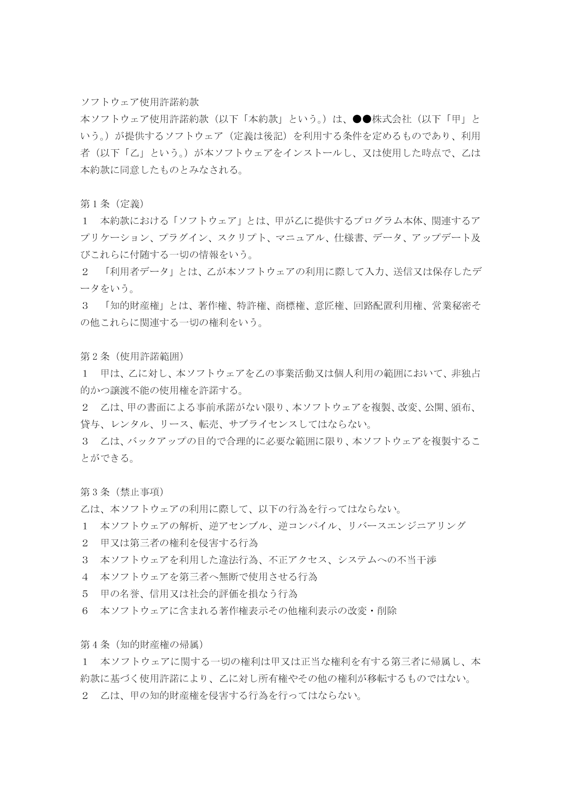 ソフトウェア使用許諾契約書は、提供者が開発したソフトウェアを利用者がどの範囲で使用できるかを定めた契約です。著作権・利用条件・禁止事項・免責・サポートの範囲などを明確化し、双方の権利とリスクを適切に調...
