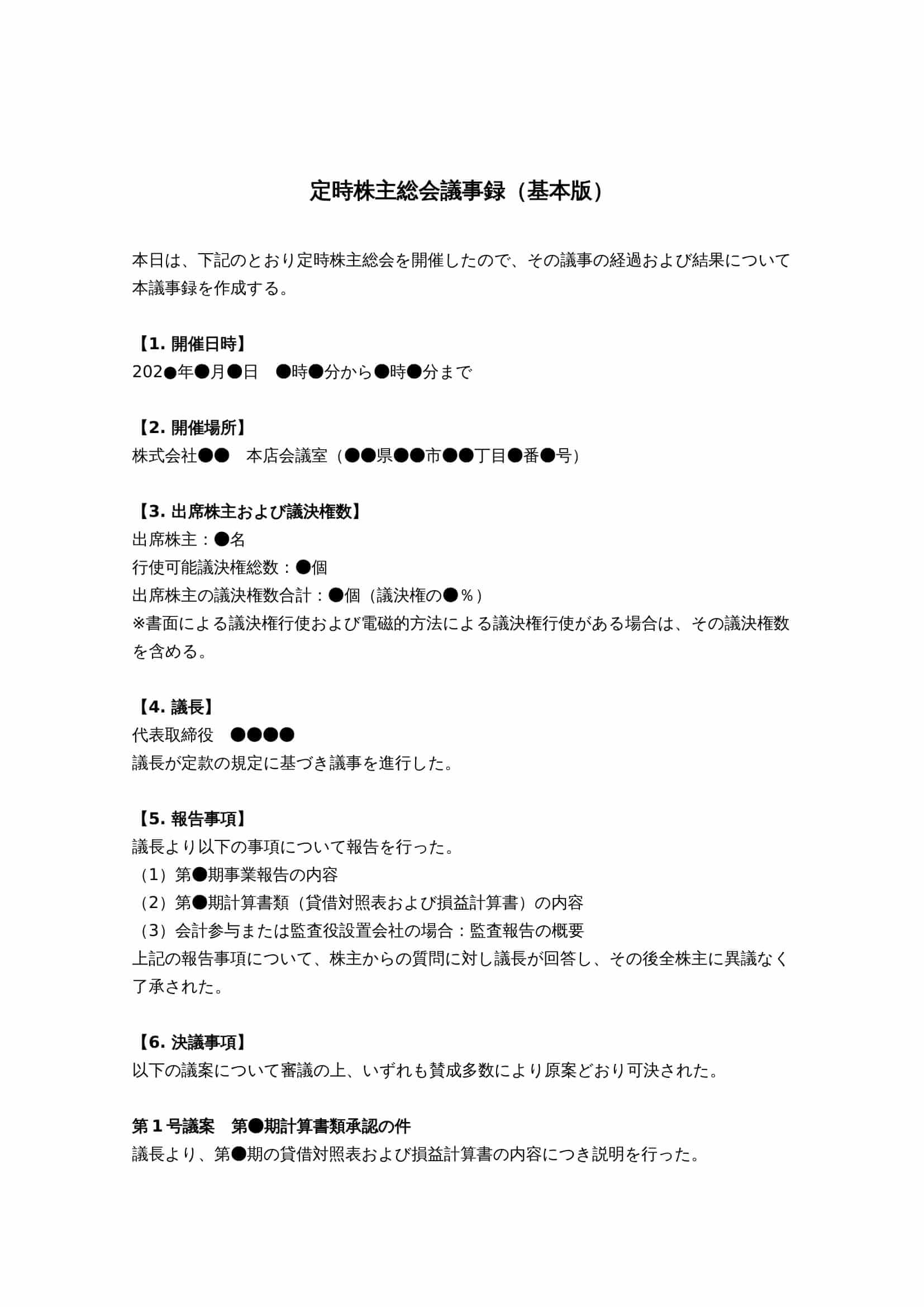 定時株主総会議事録(基本版)は、株式会社が毎事業年度の終了後に開催する定時株主総会の議事内容を正式に記録する書類です。決算承認や剰余金処分、役員選任など、毎年必ず発生する議題に対応した汎用性の高いテン...
