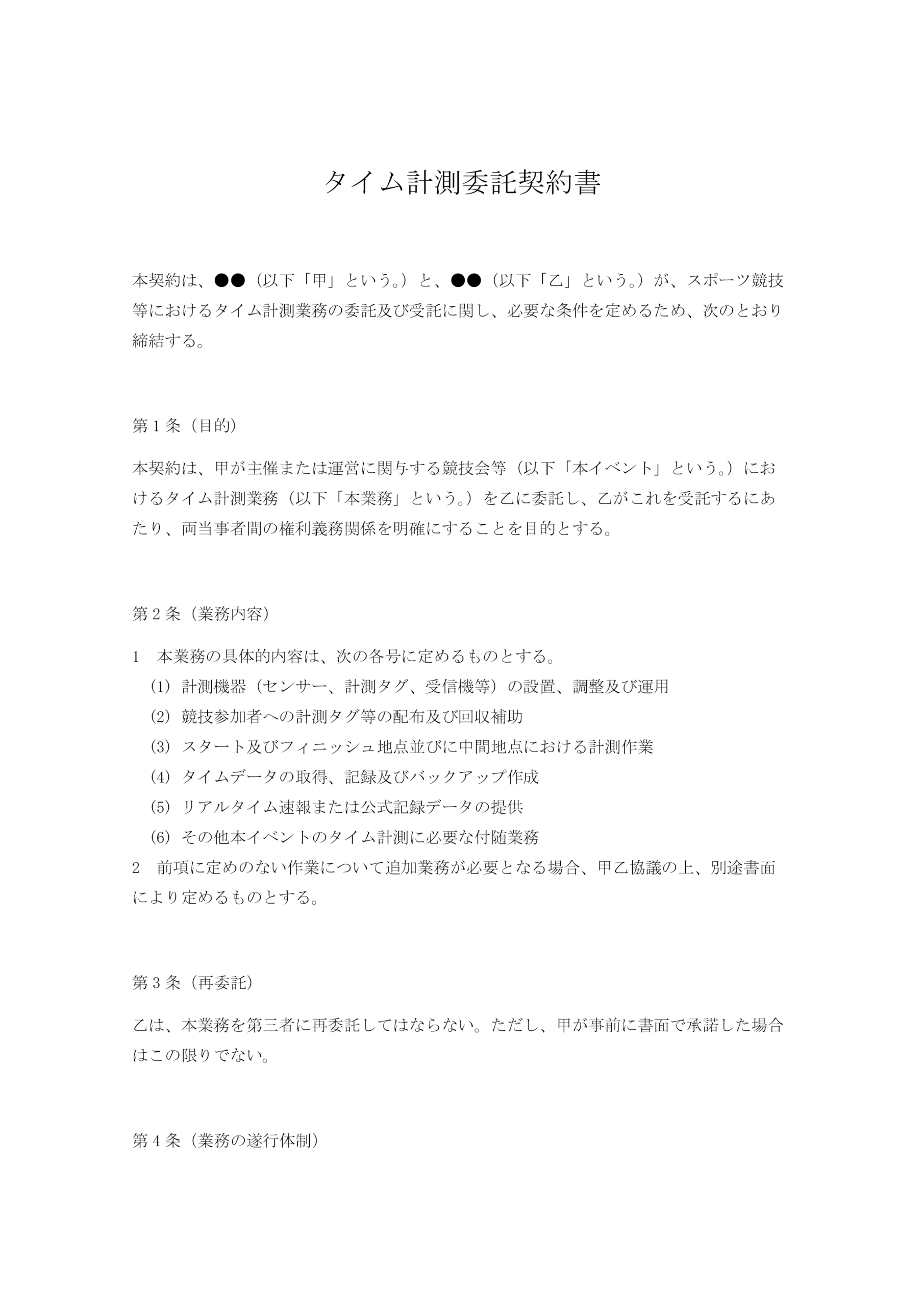 タイム計測委託契約書は、競技会やイベントにおける計測業務を外部事業者へ委託する際の条件を定める契約書です。機器の設置・運用、データ取得、成果物納品、安全管理など、主催者と計測事業者間の権利義務を明確に...
