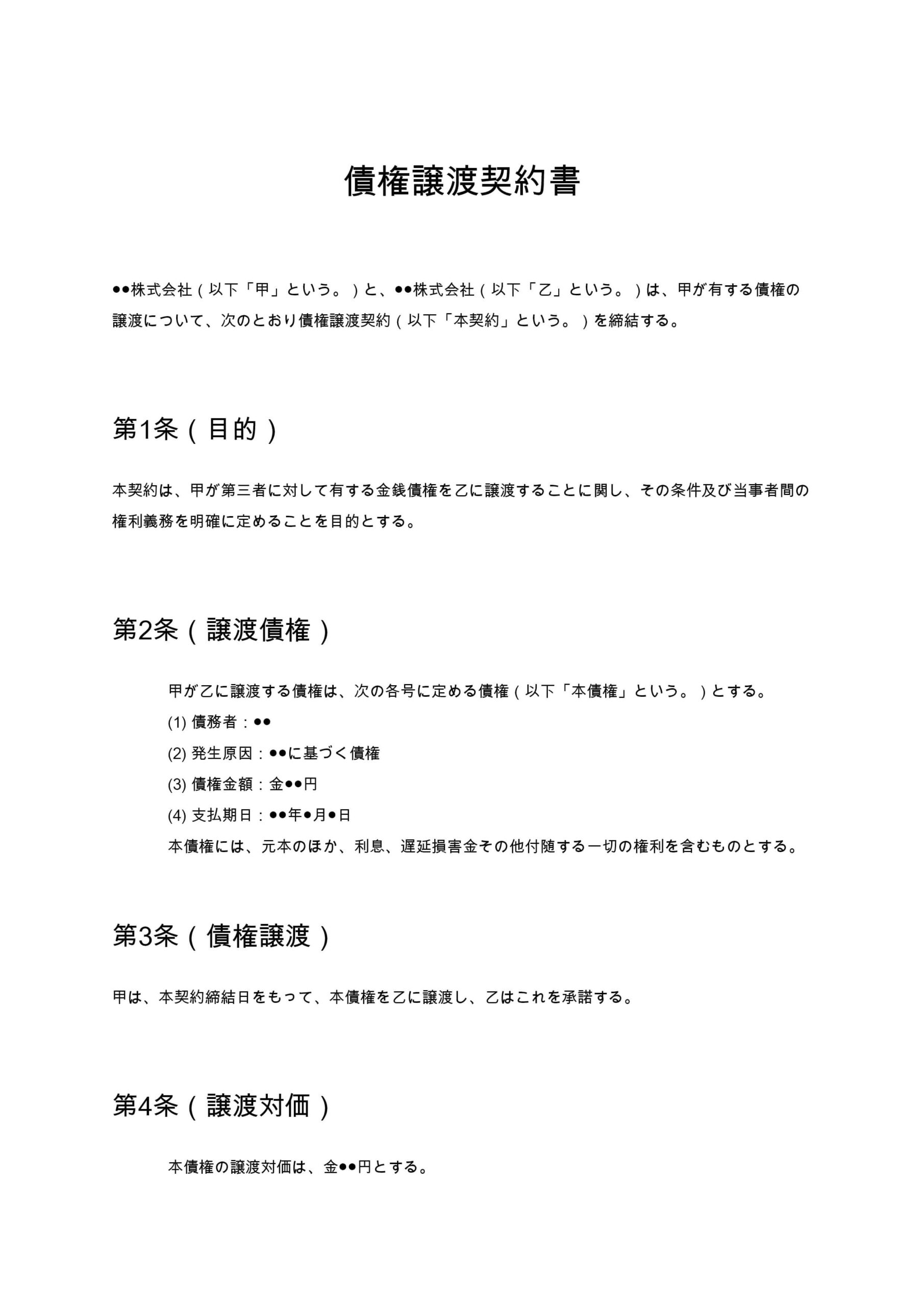 債権譲渡契約書は、企業や個人が第三者に対して有する金銭債権を、別の当事者へ正式に譲渡する際に締結する契約書です。売掛金の現金化や債権整理、事業再編など、実務で幅広く利用されます。...