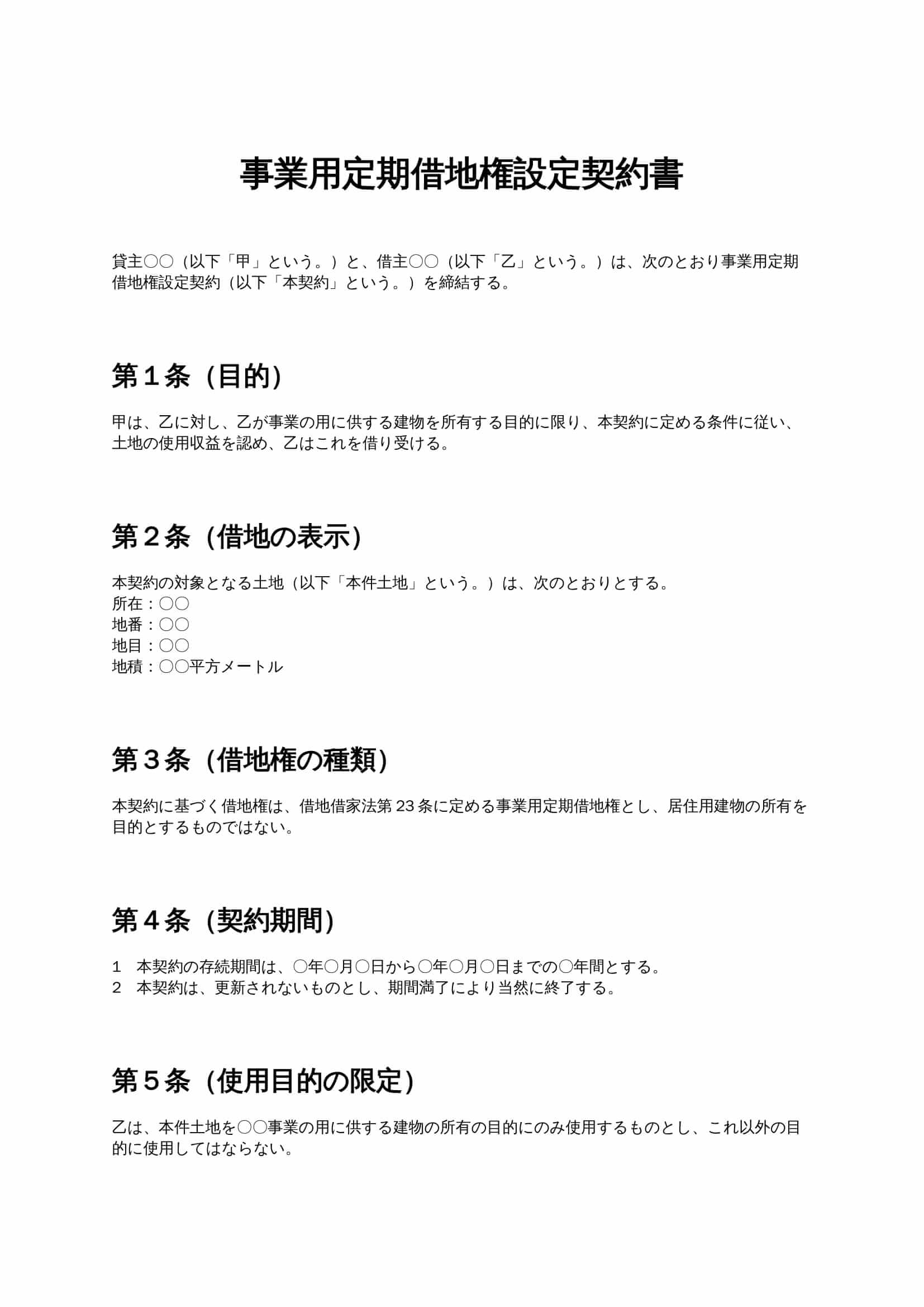 事業用定期借地権設定契約書は、事業用建物の所有を目的として、一定期間に限り土地を賃貸する際に用いられる契約書です。契約更新を行わないことを前提とし、期間満了時の原状回復や借地権の終了条件を明確に定める...