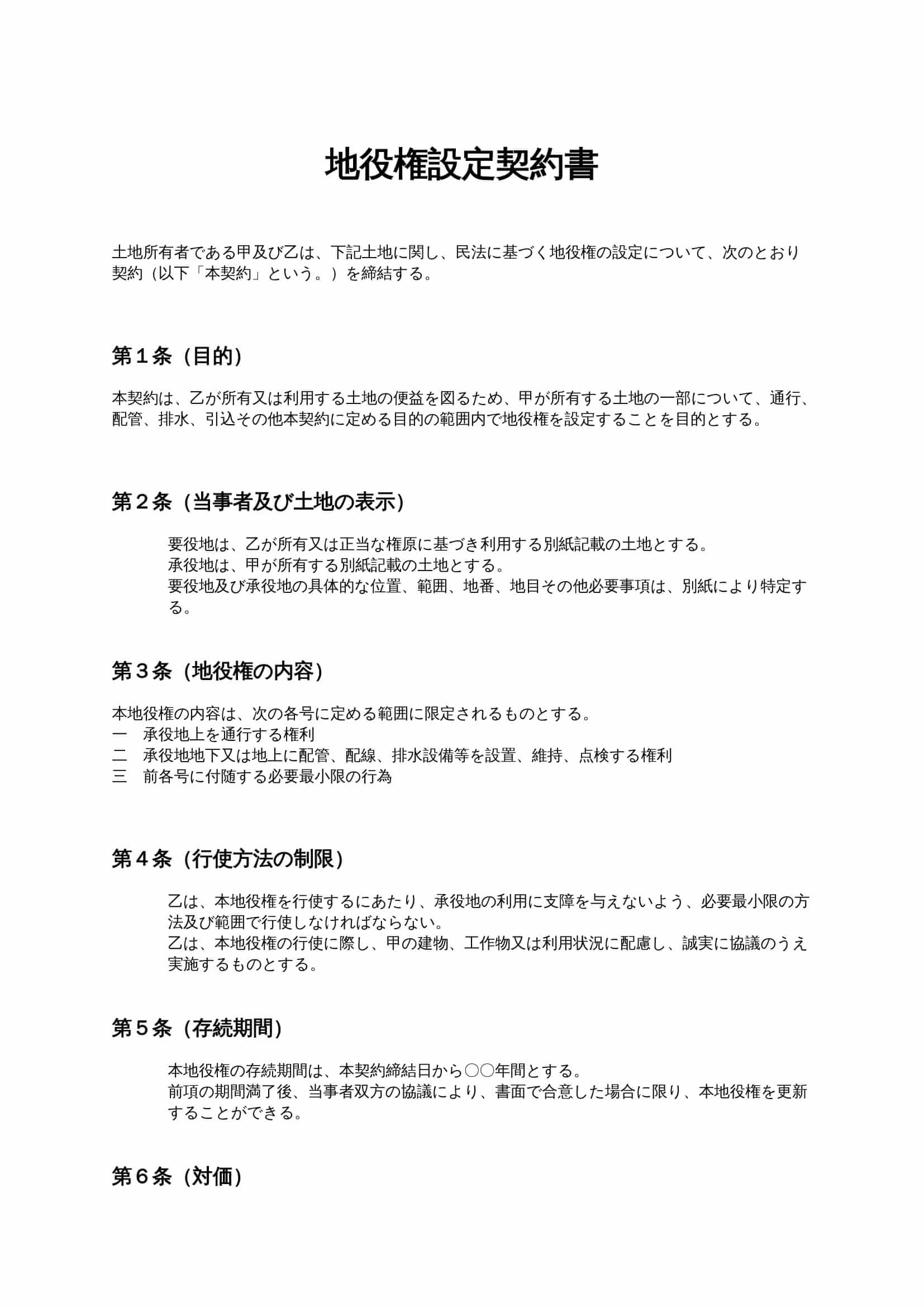 地役権設定契約書は、他人の土地を通行や配管設置などの目的で利用するために、土地所有者との間で地役権を設定する契約書です。隣地通行や上下水道引込など、不動産利用に不可欠な権利関係を明確にする際に用いられ...