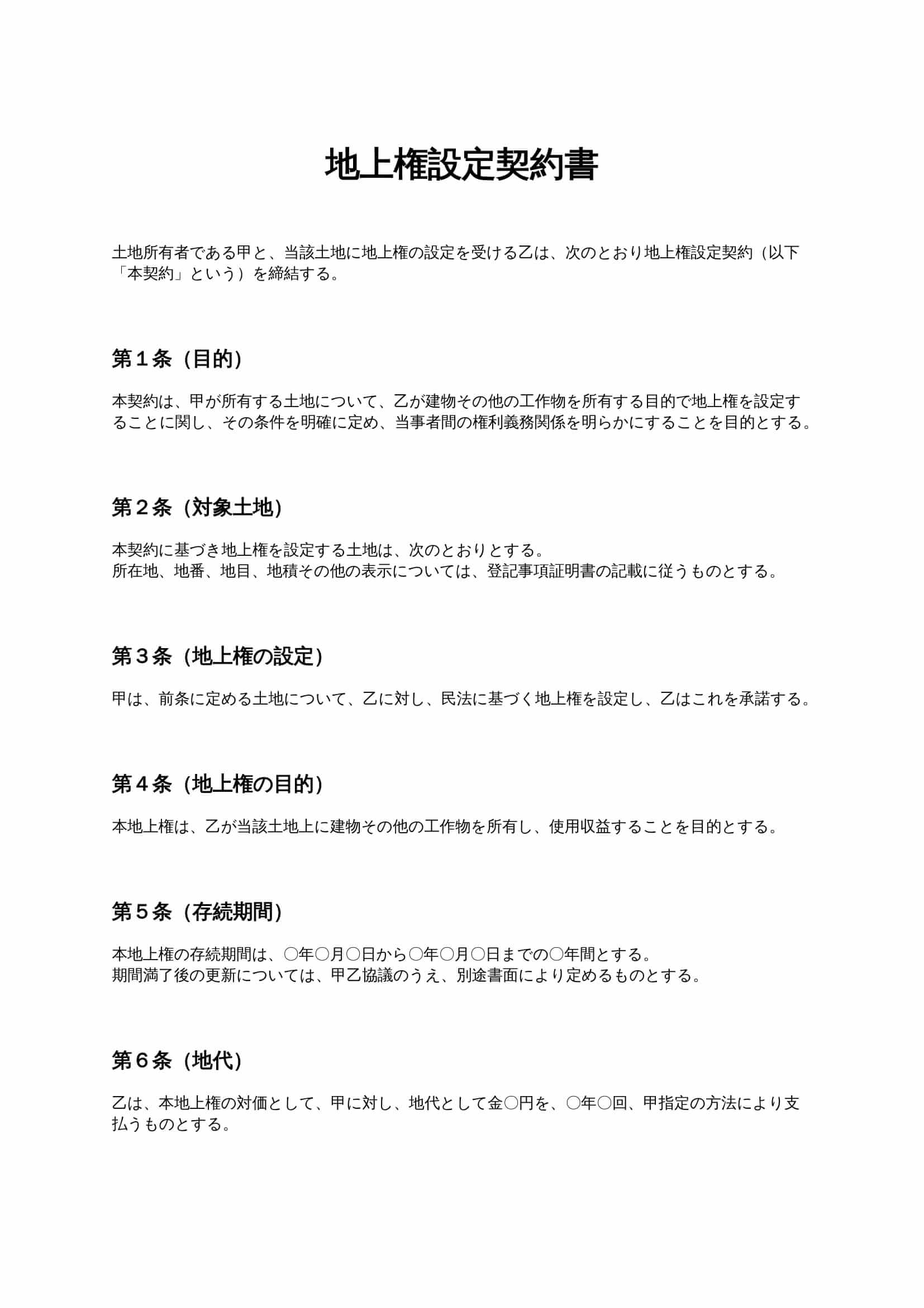 地上権設定契約書は、土地所有者が第三者に対し、建物や工作物を所有する目的で土地を使用させるために地上権を設定する契約書です。借地権とは異なり、物権として登記できるため、権利関係を安定させたい不動産取引...