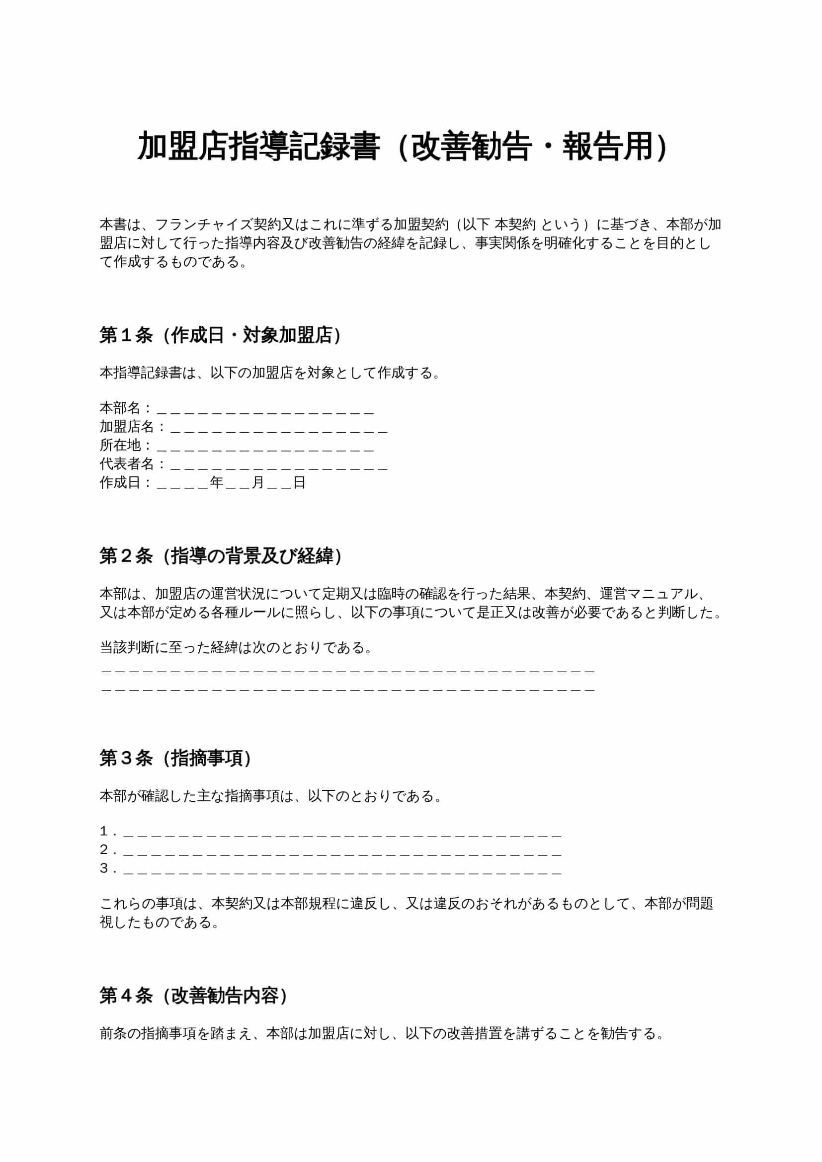 加盟店指導記録書(改善勧告・報告用)は、フランチャイズ本部が加盟店に対して行った是正指導や改善要請の内容、期限、対応状況を文書として記録・管理するための書式で、監査対応や契約管理の実務に活用できます。...