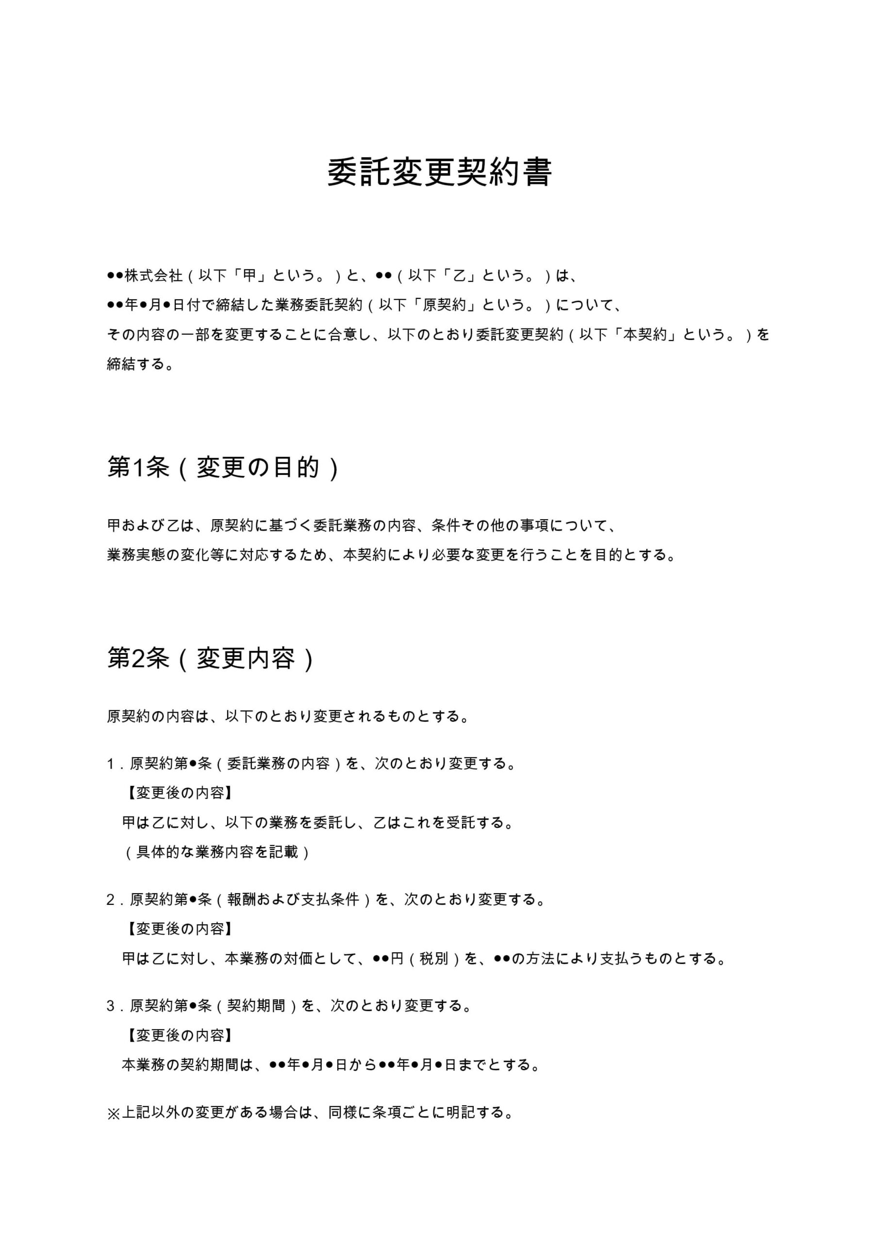 委託変更契約書は、既に締結している業務委託契約について、業務内容・報酬・契約期間などの条件を途中で変更する際に用いる契約書です。業務の追加・範囲変更・単価改定など、実務上頻繁に発生する変更を法的に明確...
