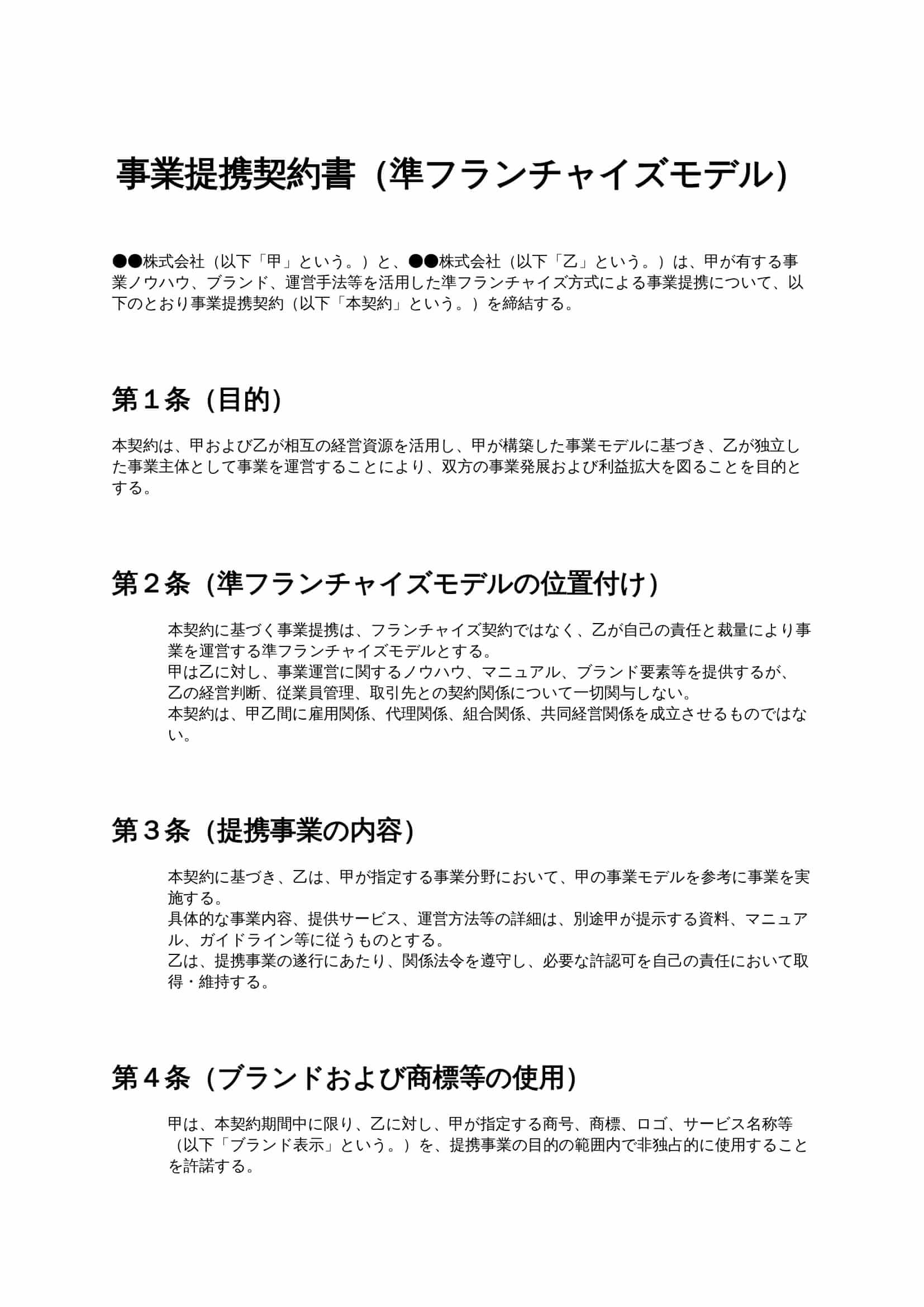 事業提携契約書(準フランチャイズモデル)は、本部がノウハウやブランドを提供しつつ、加盟側が独立した事業主体として運営する形態を想定した契約書です。フランチャイズほどの拘束を伴わず、協業による事業拡大を...
