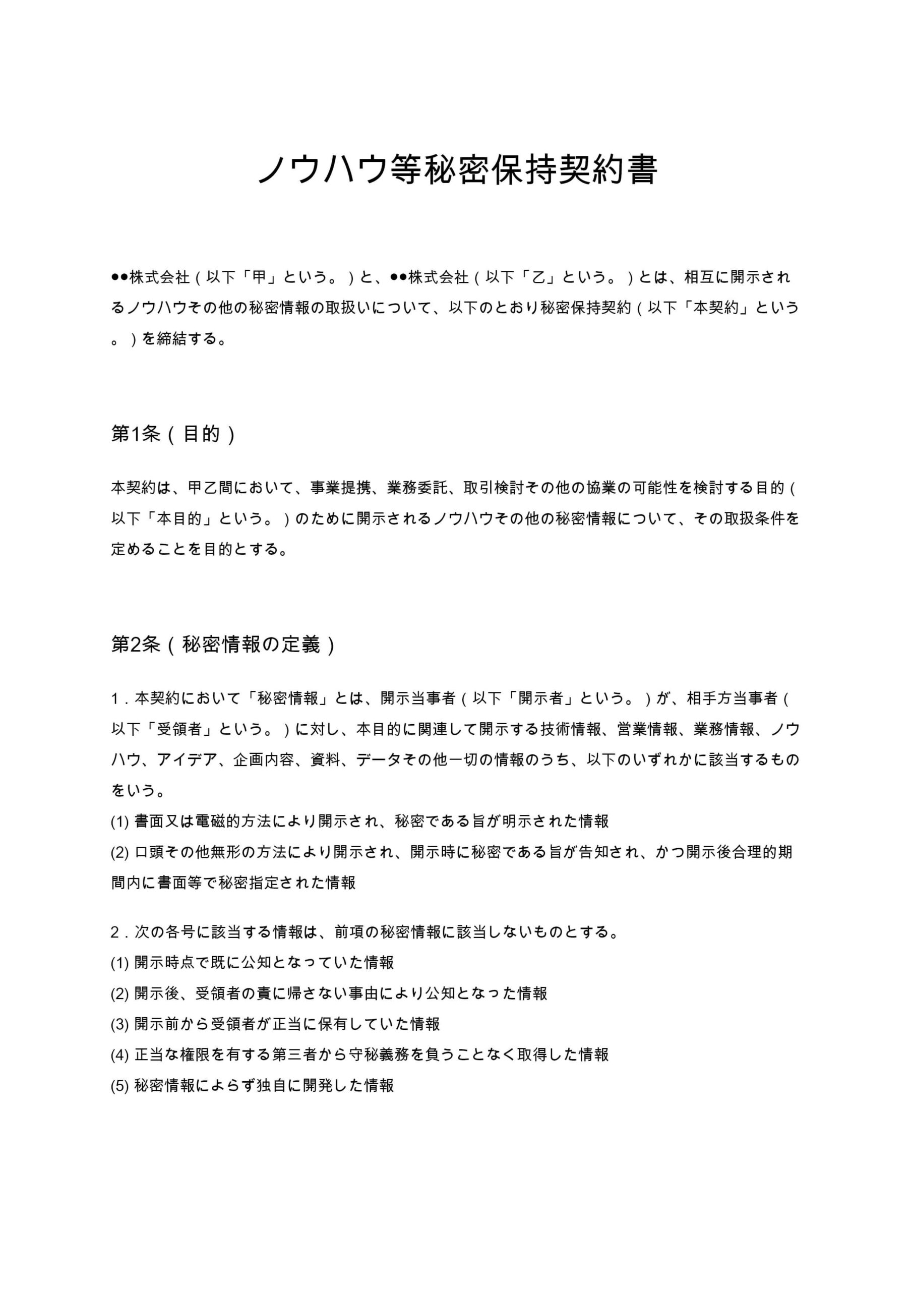 ノウハウ等秘密保持契約書は、事業提携や業務委託、取引検討の過程で開示される技術情報・営業情報・ノウハウなどを第三者への漏えいや目的外利用から保護するための契約書です。企業間・個人事業主間を問わず幅広く...
