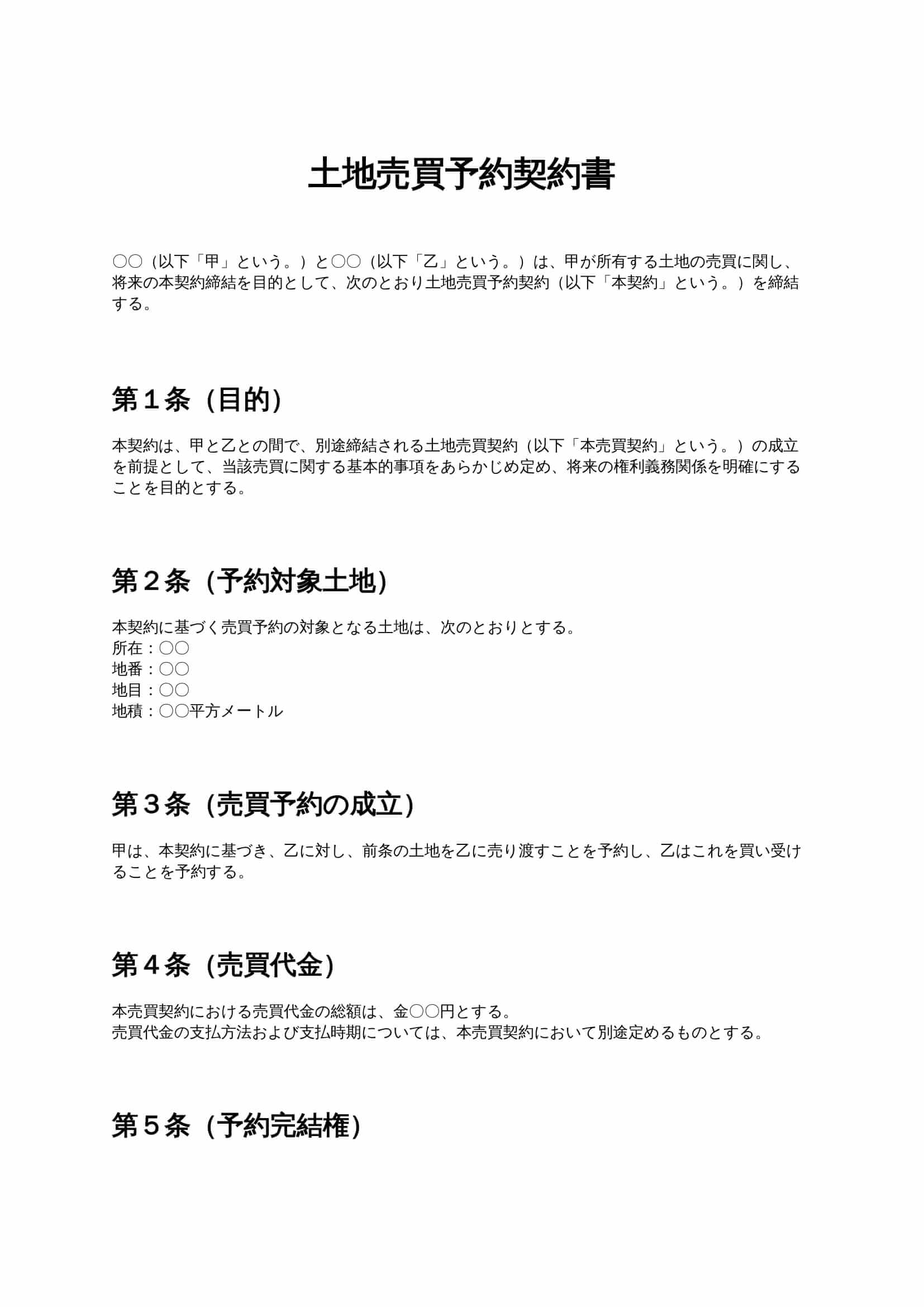 土地売買予約契約書は、将来締結する土地売買契約を前提として、売主と買主の間で売買条件や予約完結権などを事前に定める契約書です。本契約前の権利関係を明確にし、取引の安全性を高めるために用いられます。...