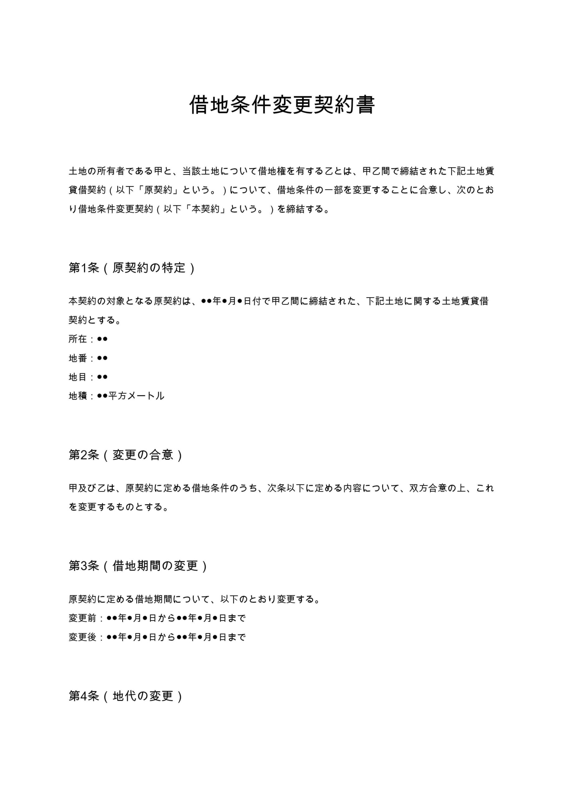 借地条件変更契約書は、既存の借地契約について、借地期間・地代・使用目的などの条件を当事者間の合意により変更する際に用いる契約書です。地主と借地人の合意内容を明確化し、後日の紛争防止を目的として締結され...