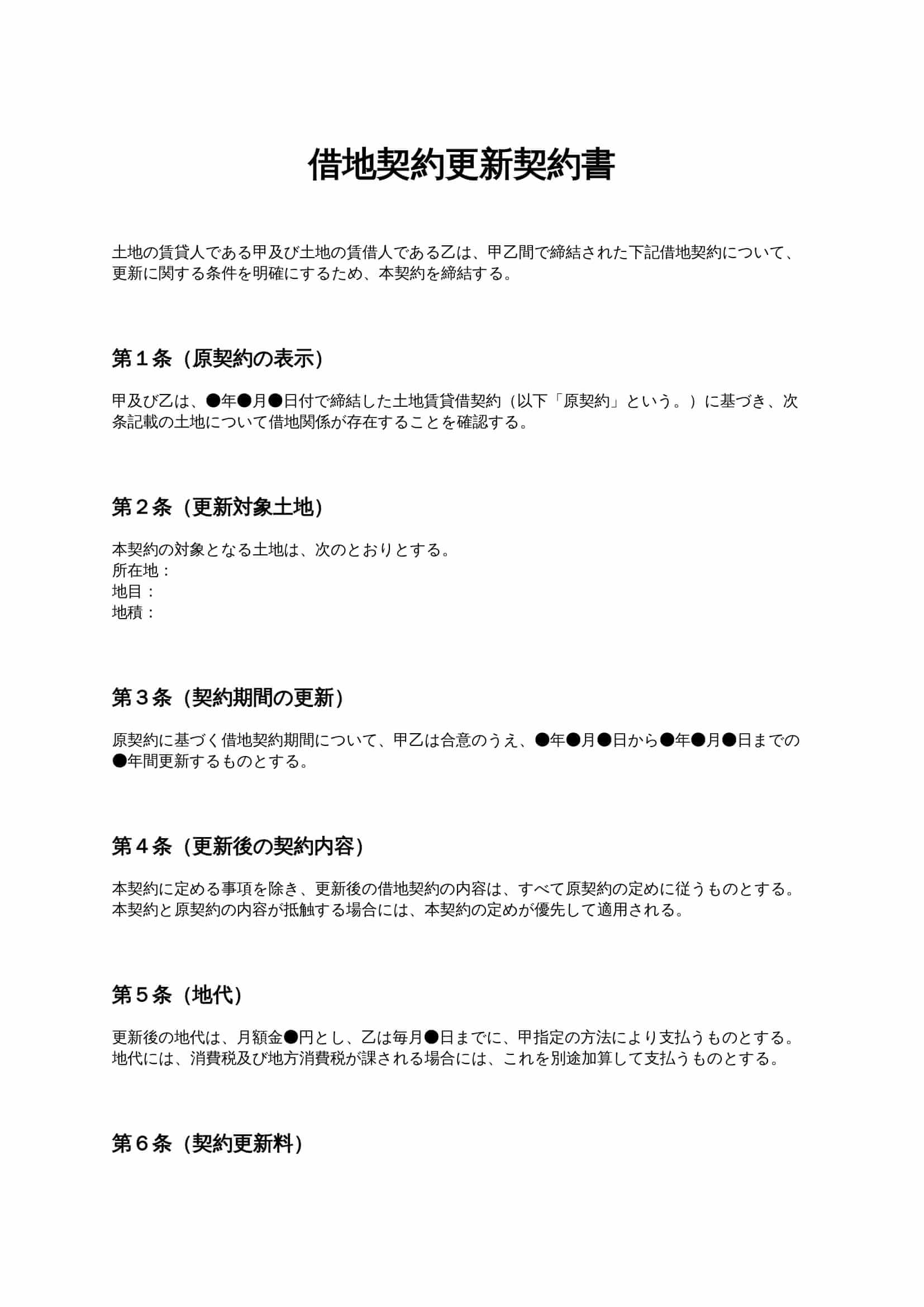 借地契約更新契約書は、既存の借地契約期間が満了する際に、契約条件を確認・整理したうえで借地関係を継続するための契約書です。更新期間、地代、更新料などを明確にし、将来の紛争を防ぐ目的で用いられます。...