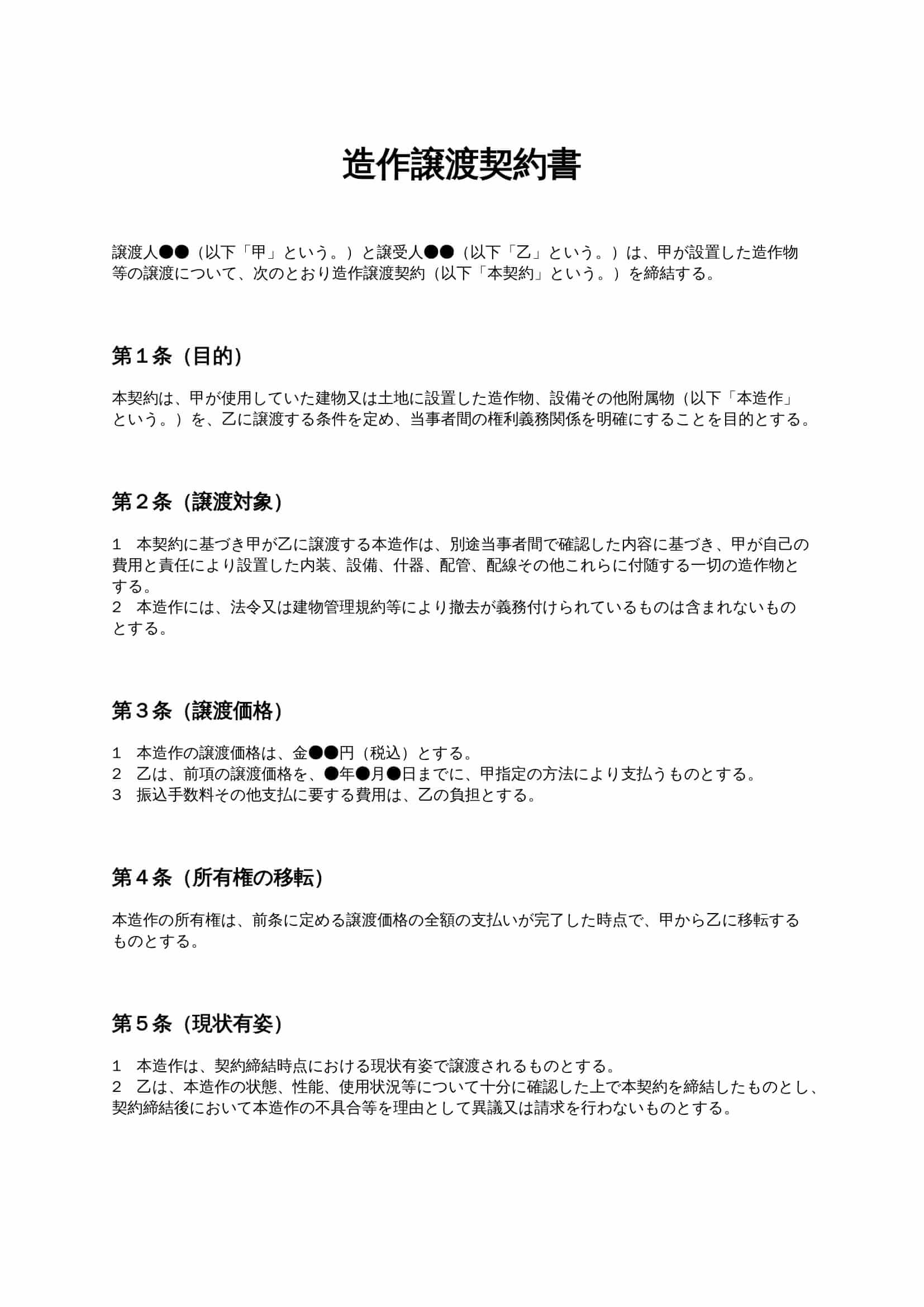造作譲渡契約書は、店舗や事務所の内装・設備・什器などの造作物を第三者へ譲渡する際に用いる契約書です。譲渡対象や価格、現状有姿、責任範囲を明確にし、後日のトラブル防止を目的として締結されます。 ...