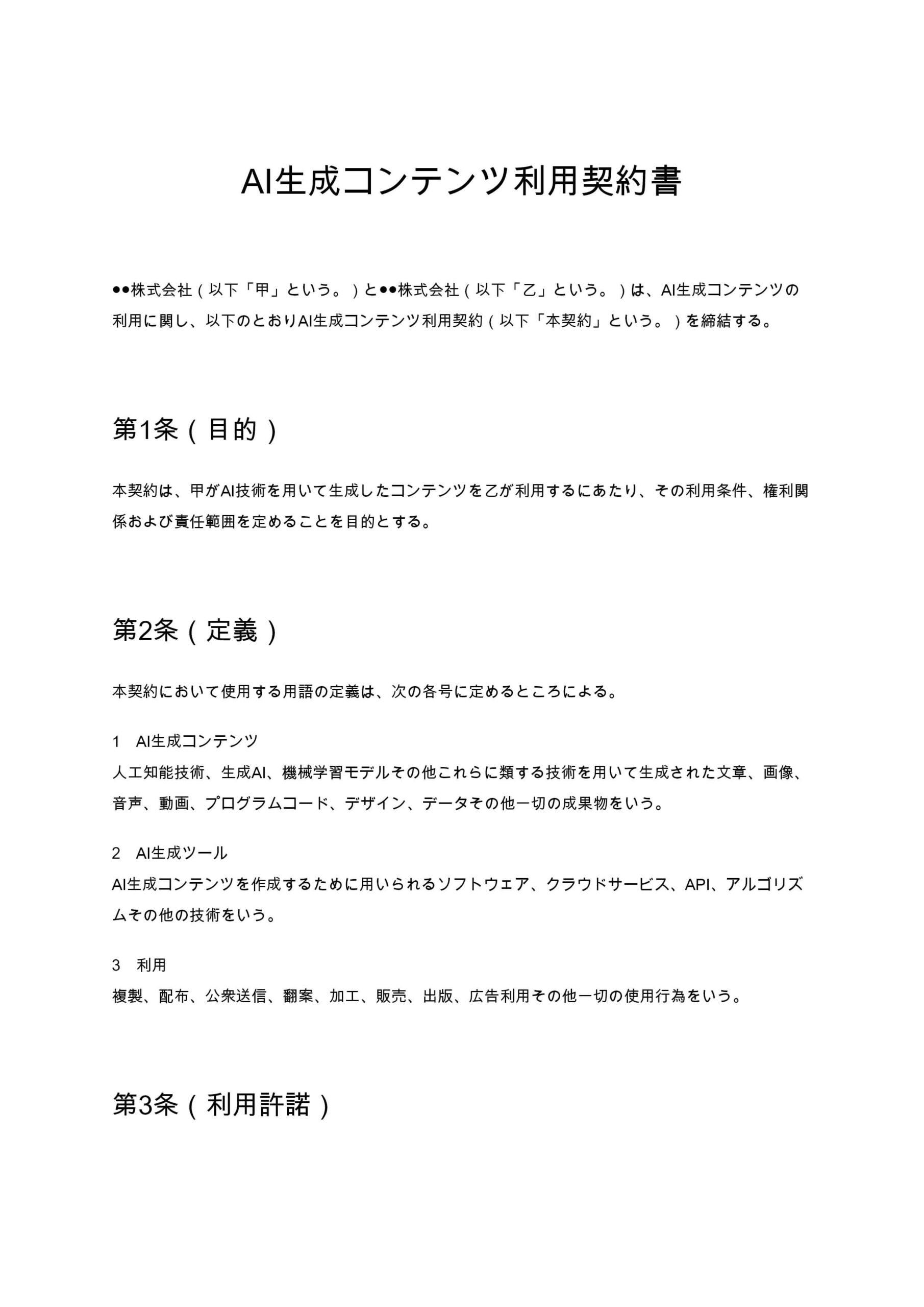 - AI特有のリスクを契約書に反映する AI生成物の誤情報や類似コンテンツなどのリスクを考慮した条項を入れることが重要です。