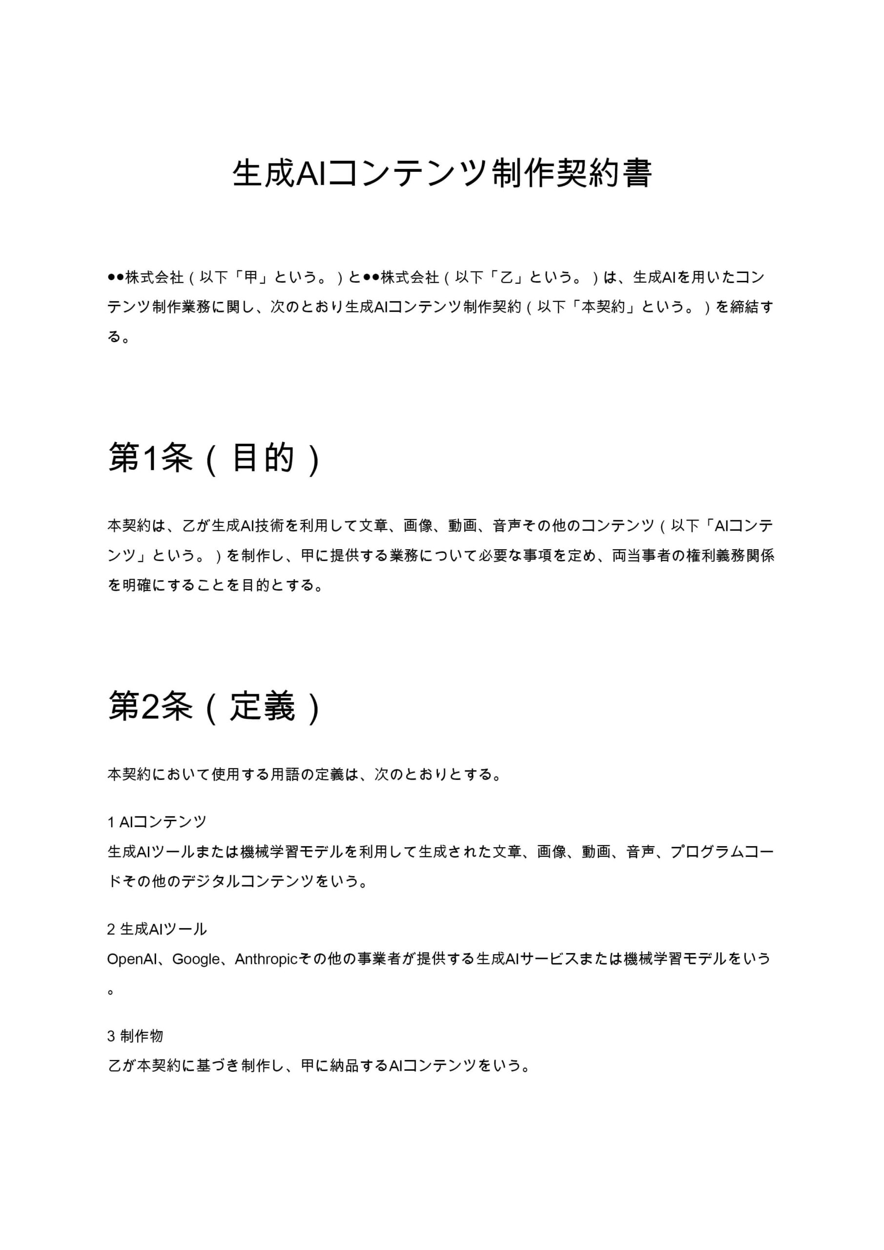 AIマーケティング分析契約書では、通常の業務委託契約に加えて、AI特有の条項を定める必要があります。代表的な条項は次のとおりです。