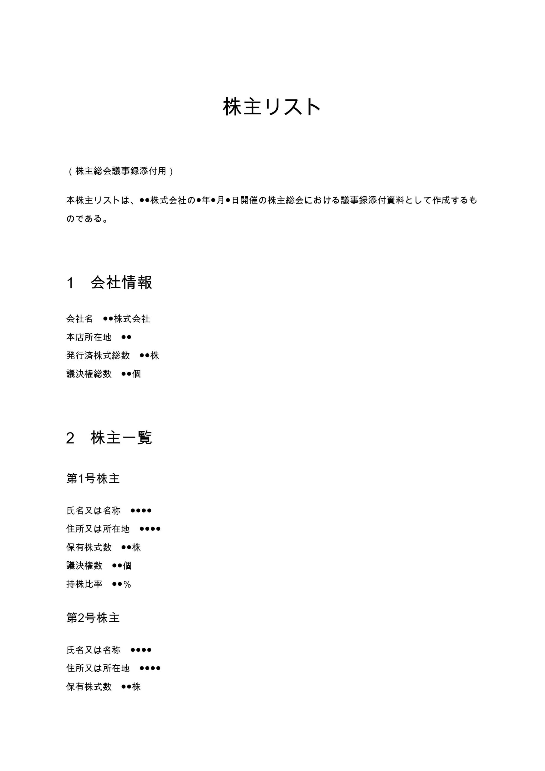 - 株主総会の開催日時および場所 決議の適法性を担保するため、開催情報を明確にします。