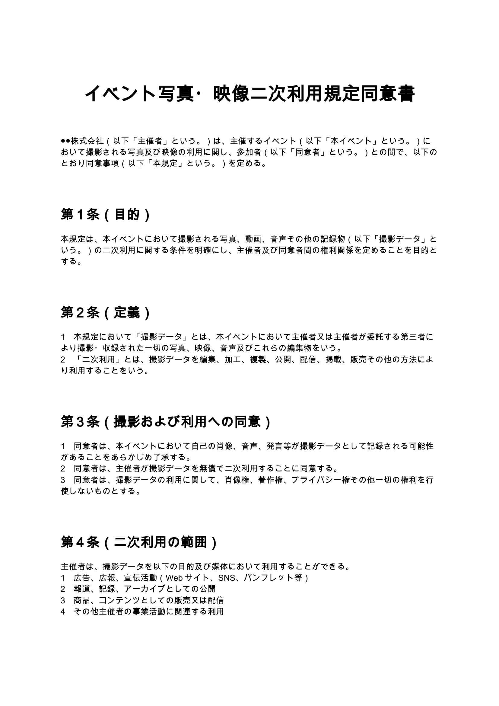 イベント写真・映像の二次利用同意書には、以下の条項を必ず盛り込む必要があります。