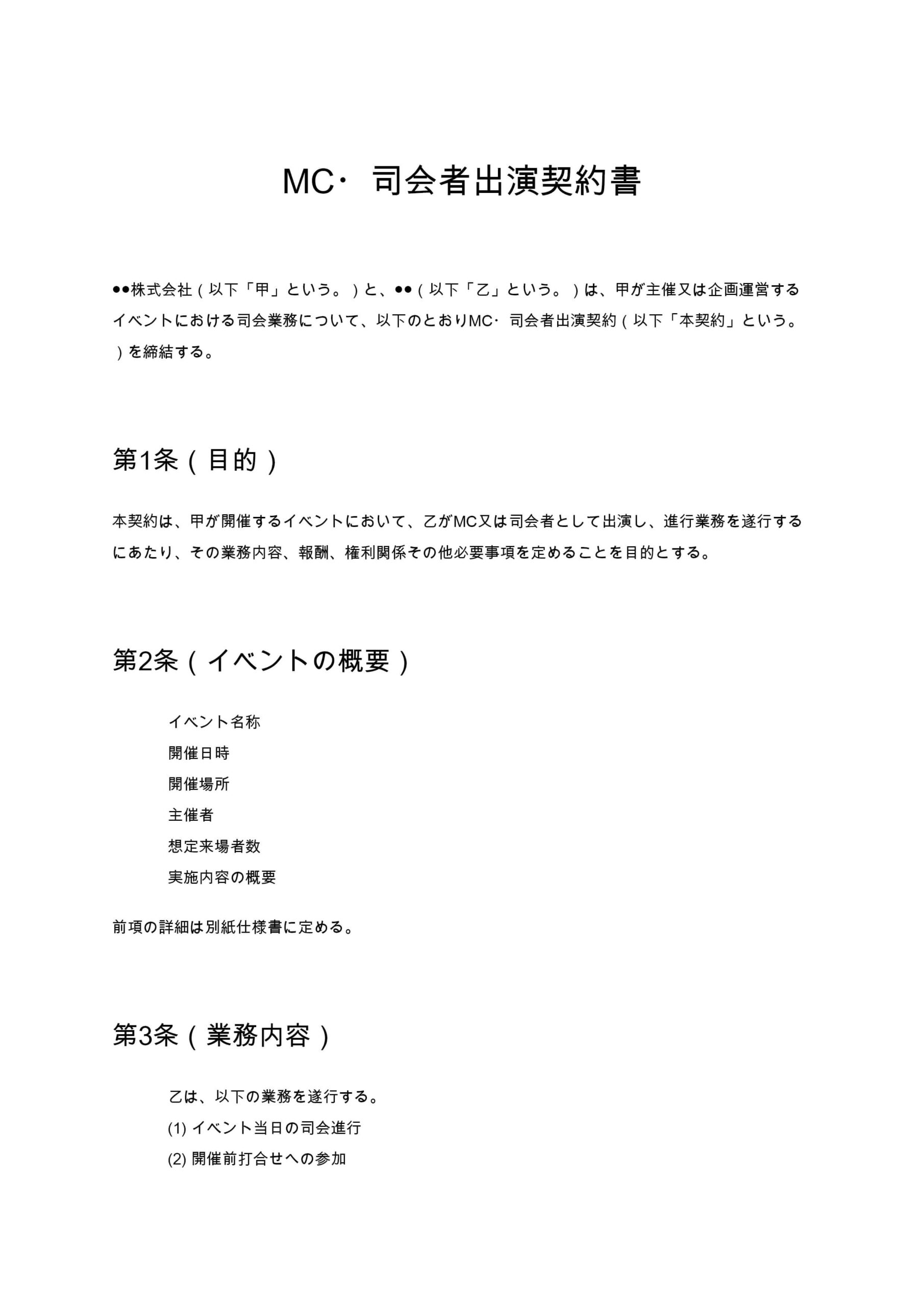 出演契約では、具体的な業務範囲を定めることが重要です。単に出演と記載するだけでは、トーク企画参加、商品紹介、写真撮影、SNS投稿などの義務範囲が不明確になります。後日のトラブルを防ぐため、可能な限り詳細に定義することが望ましいです。
