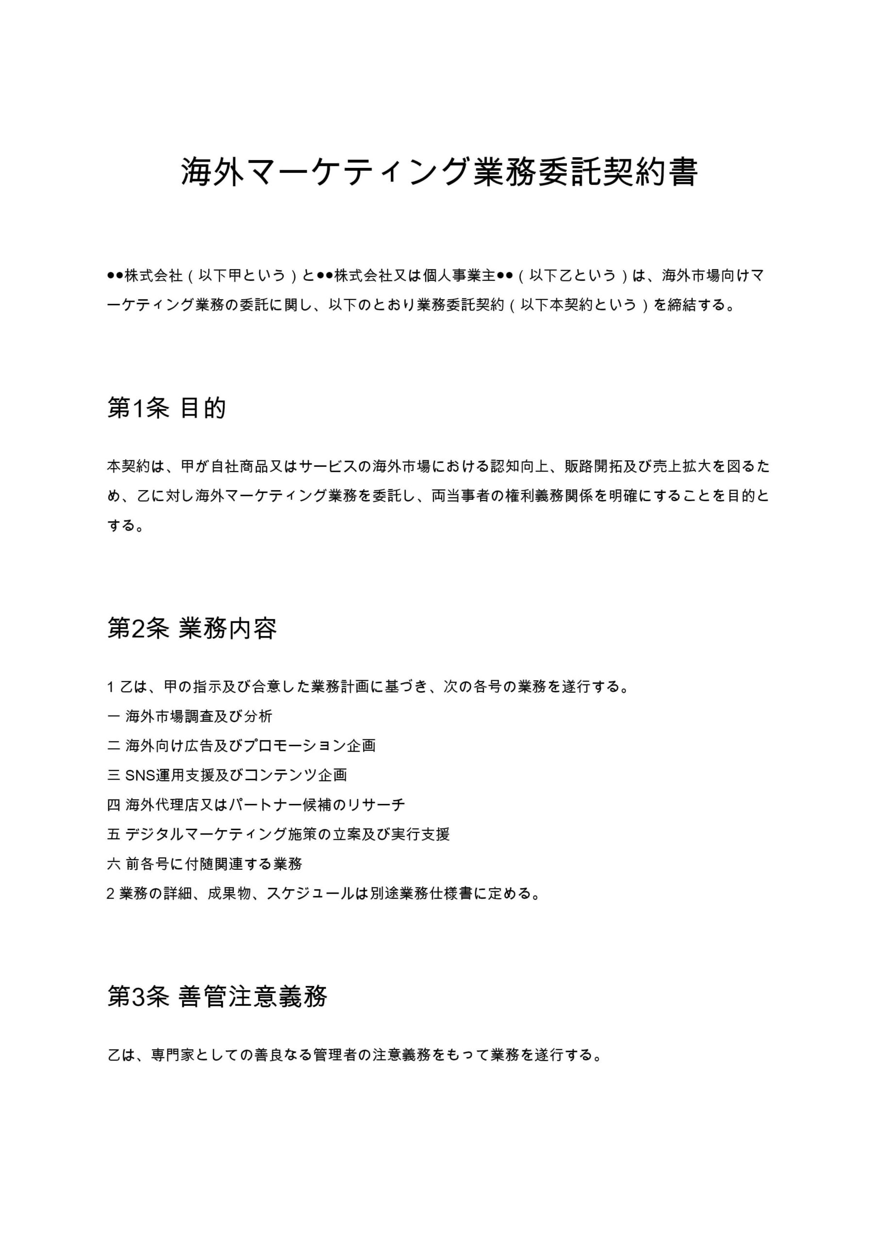 最も重要な条項です。海外マーケティングは業務範囲が広く、曖昧なまま委託するとトラブルの原因になります。