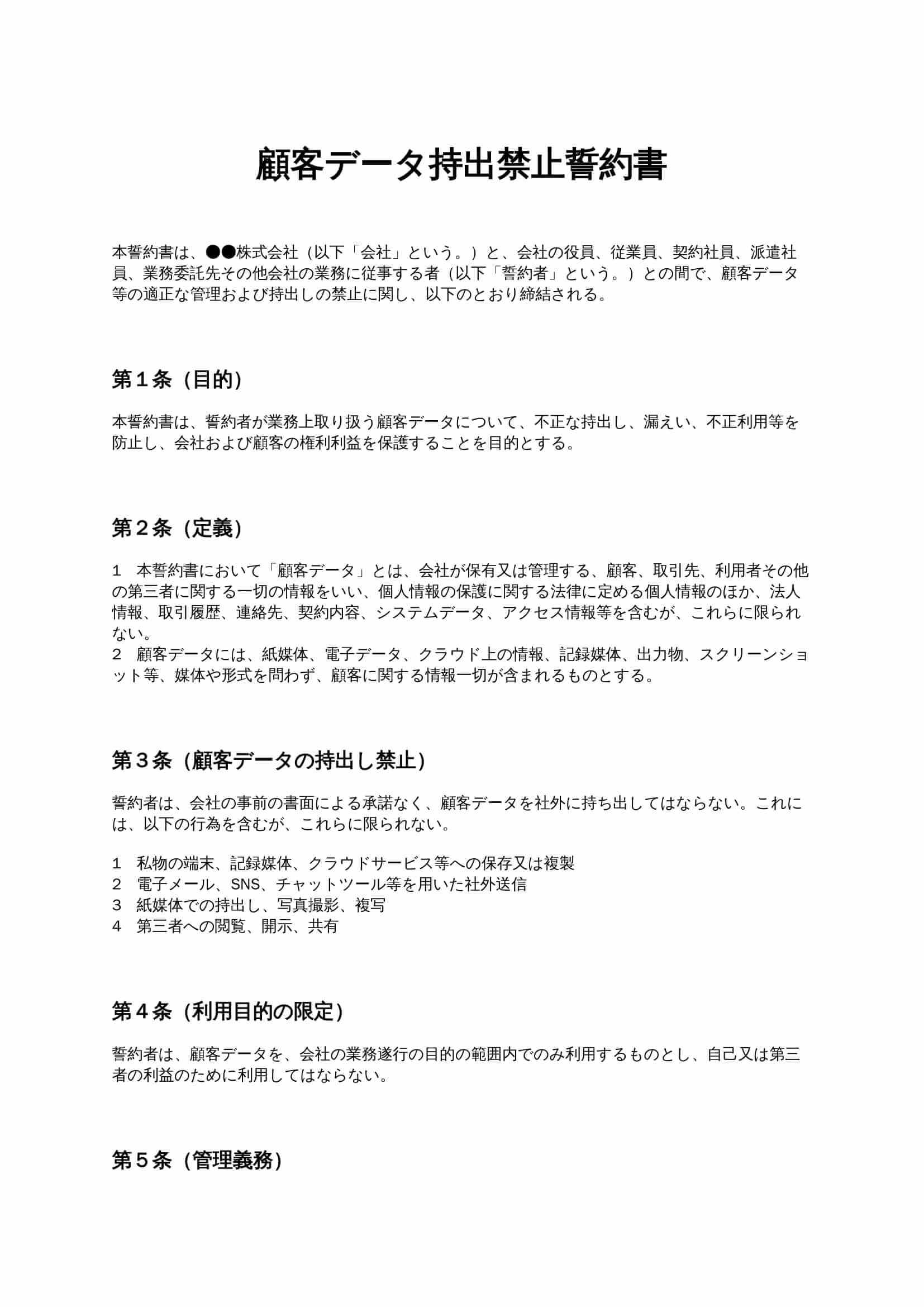 顧客データ持出禁止誓約書は、従業員や業務委託先が業務上取り扱う顧客情報を社外へ持ち出すことを防止するための誓約書です。情報漏えいや内部不正のリスクを抑え、企業の信頼性と顧客の権利を守る目的で用いられま...