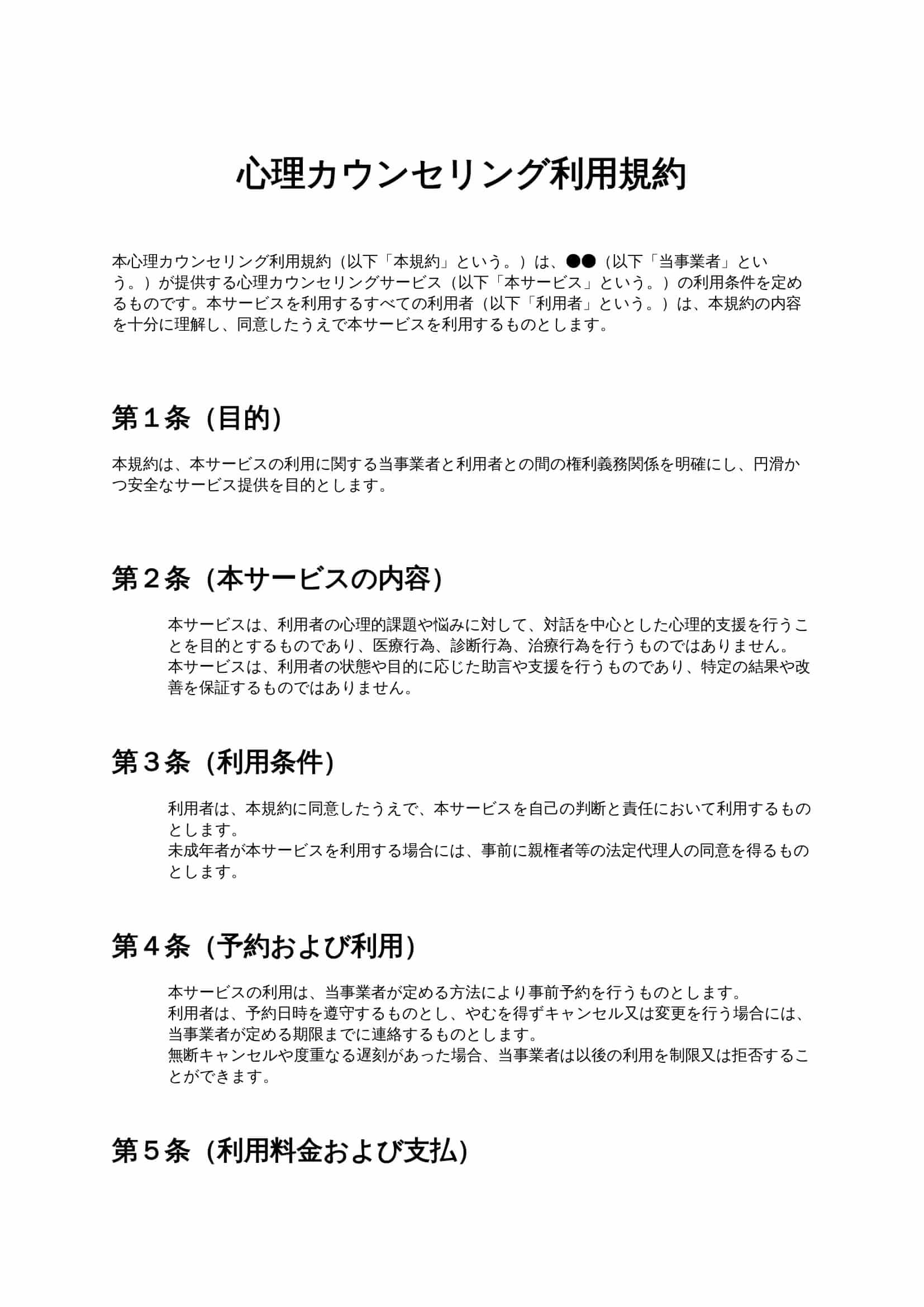 心理カウンセリング利用規約は、カウンセリングサービス提供者と利用者との間で、サービス内容、守秘義務、免責事項、禁止事項などを明確に定めるための利用規約です。オンライン・対面を問わず、安心してカウンセリ...