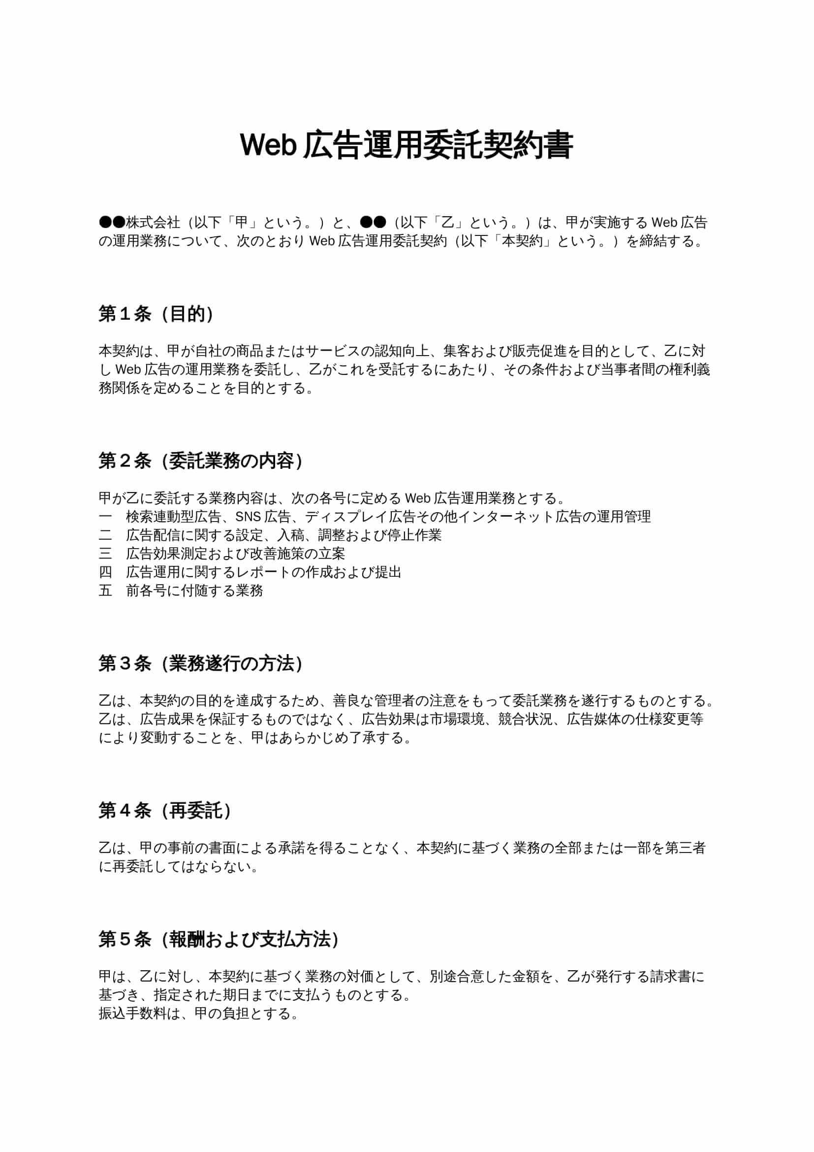 Web広告運用委託契約書は、企業が広告代理店やフリーランスに対し、リスティング広告やSNS広告などの運用業務を委託する際に、業務内容、報酬、責任範囲、秘密保持等を明確に定めるための契約書ひな形です。...