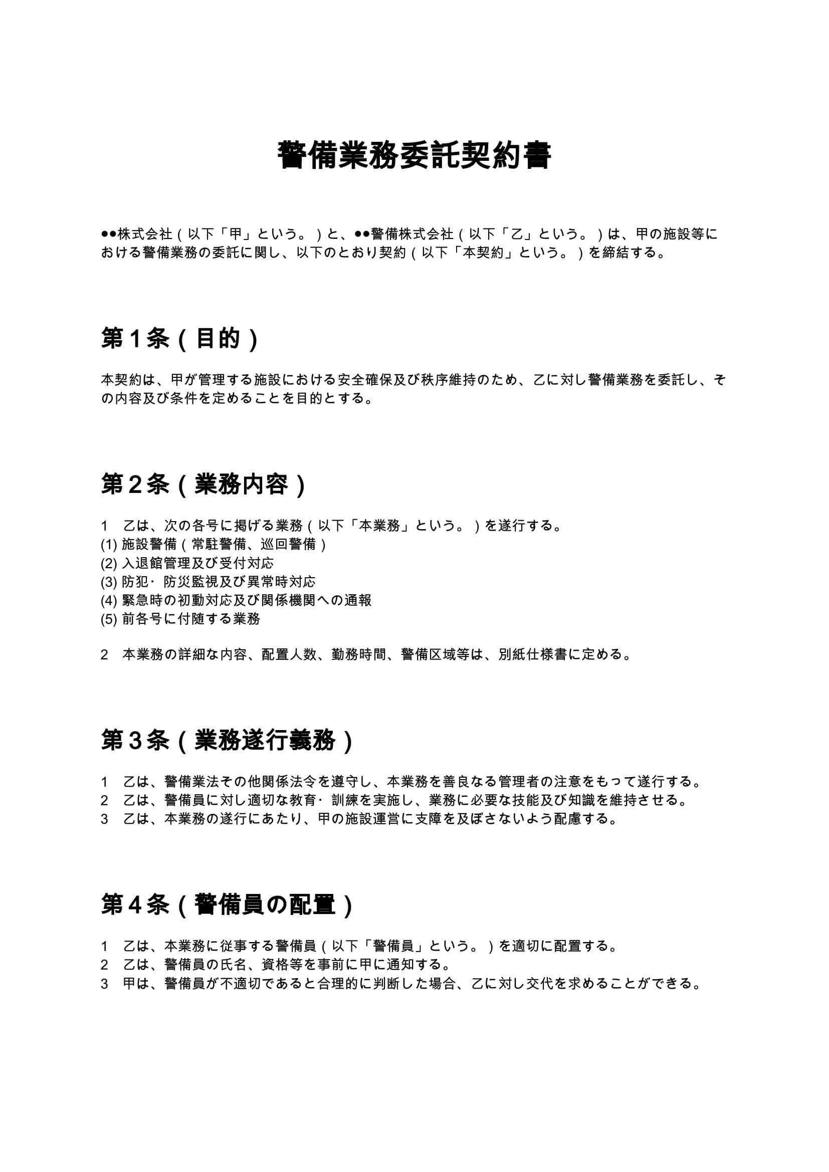 警備業務委託契約書には、以下のような条項を必ず盛り込む必要があります。