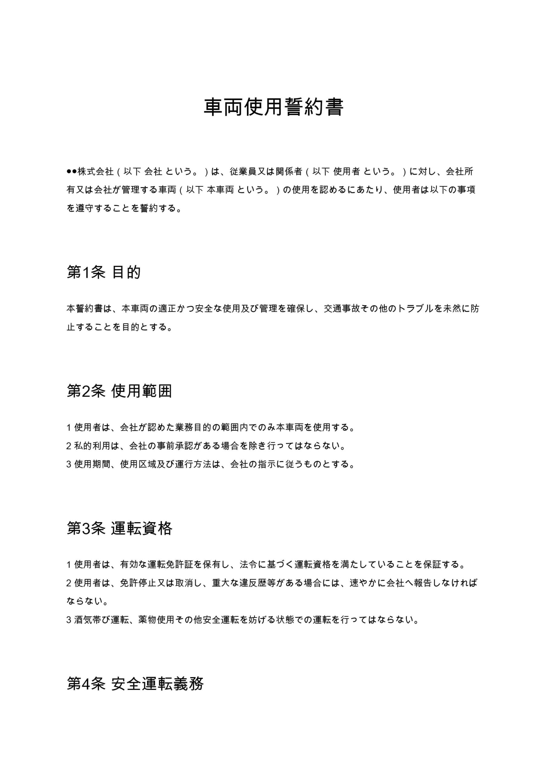 実務上、車両使用誓約書には次のような条項を盛り込むことが望ましいです。
